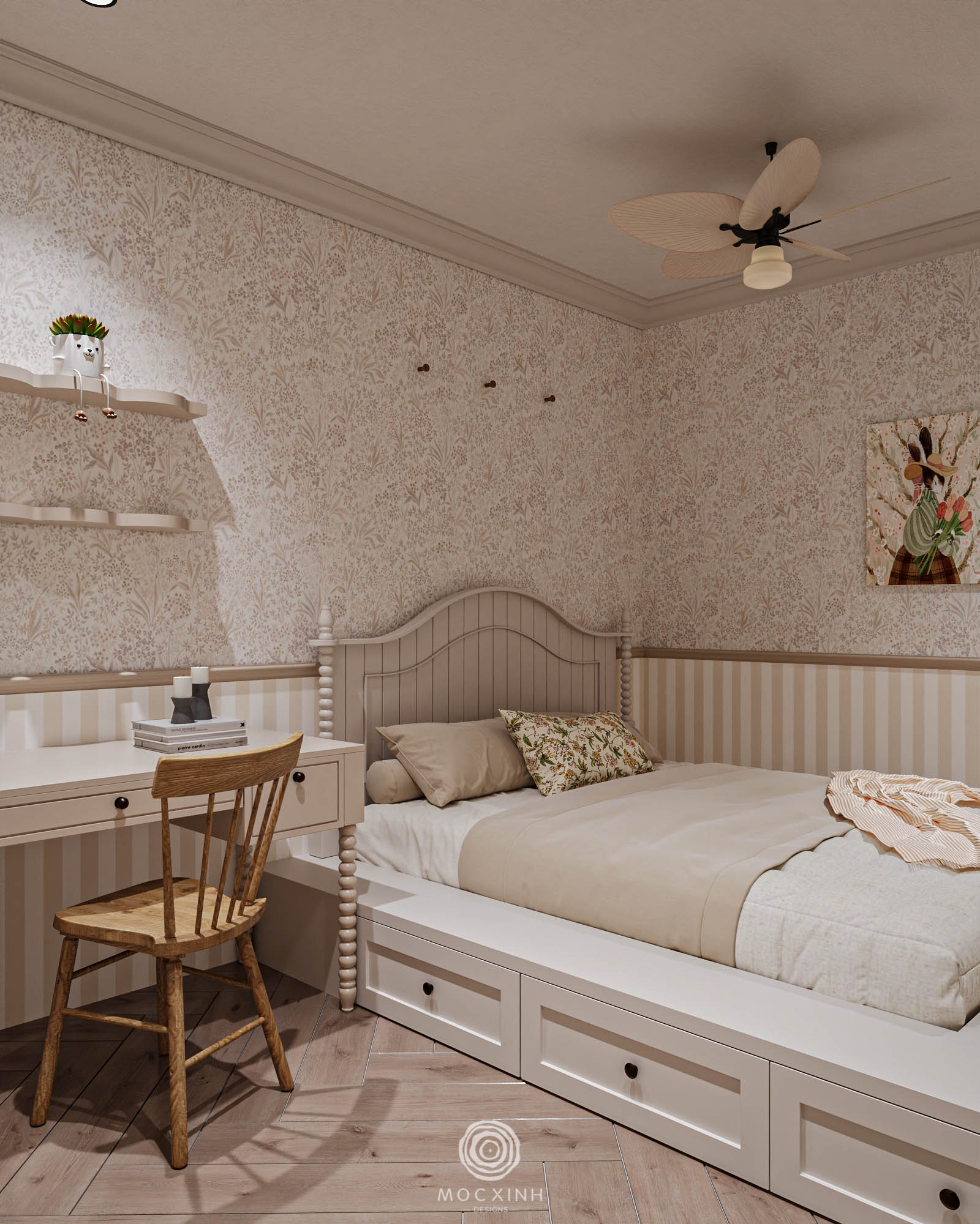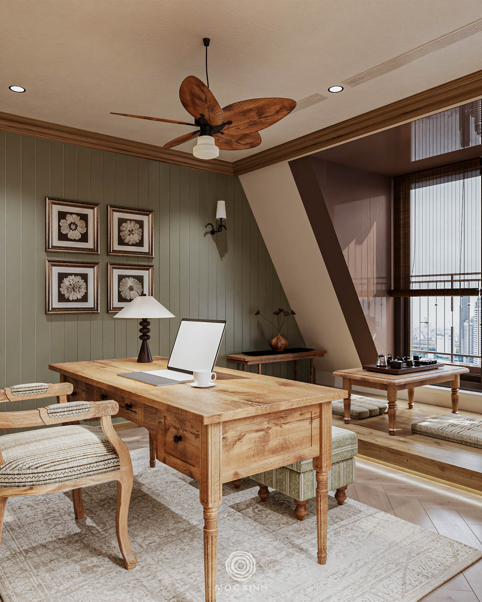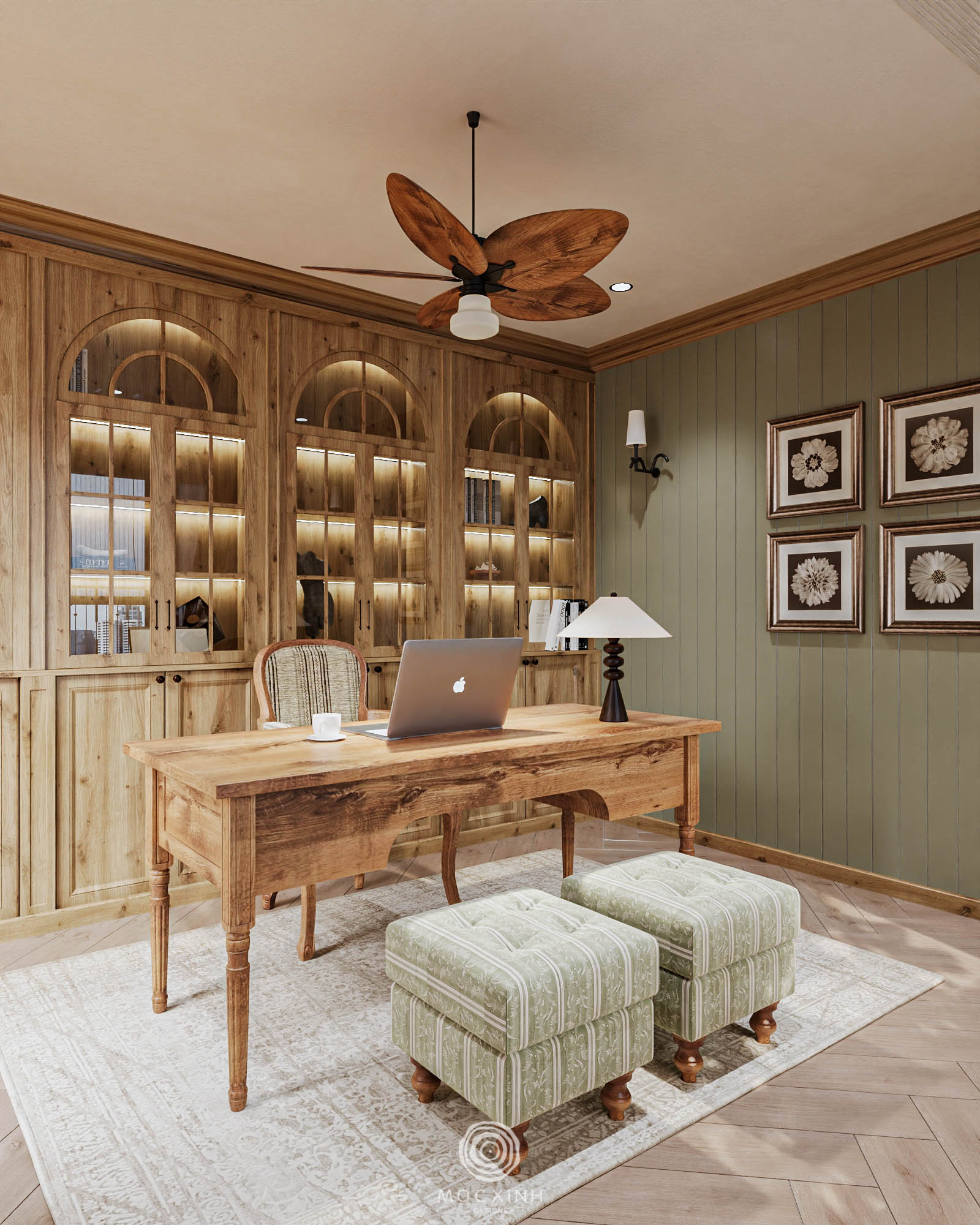 Căn phòng là nơi lý tưởng để làm việc và thư giãn. Ánh sáng tự nhiên tràn vào từ cửa sổ lớn, tạo ra một không gian ấm áp và dễ chịu. Bàn làm việc bằng gỗ được sắp xếp chính giữa phòng, mang nét nổi bật của phong cách Farmhouse gần gũi.