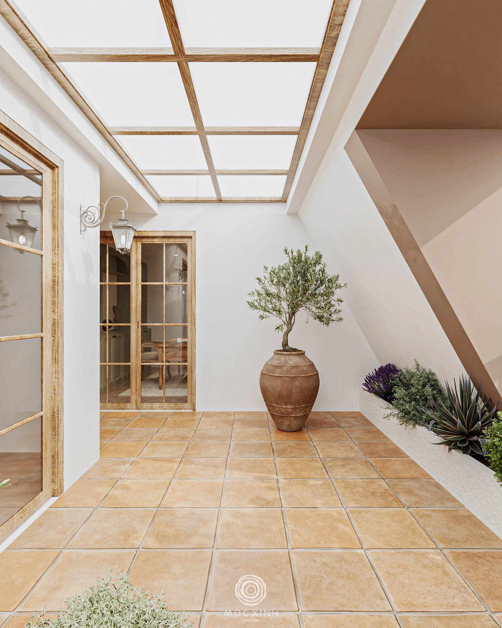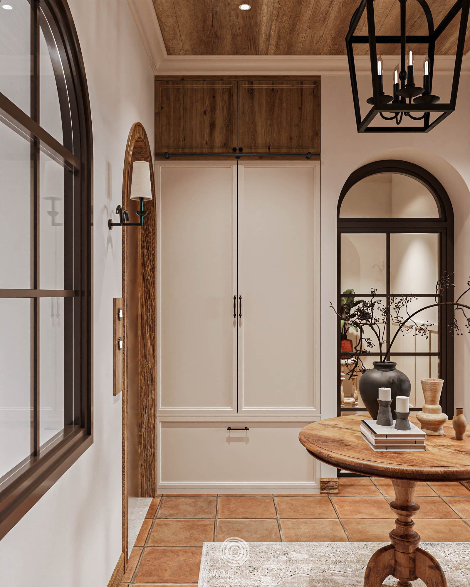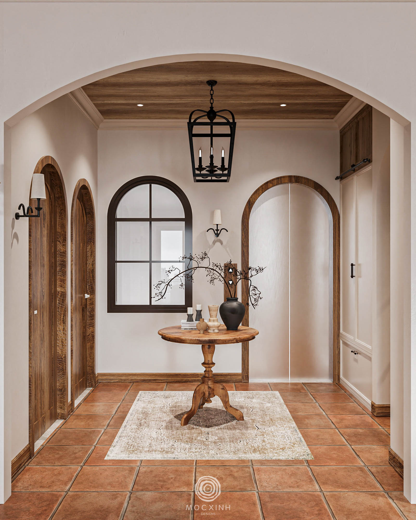 Khu vực sảnh vào với những vòm cong thanh thoát tạo nên ranh giới tự nhiên giữa không gian đón tiếp và bên trong ngôi nhà. Điểm nhấn của không gian là hệ thống vách ốp nan gỗ lớn cùng cánh cửa có họa tiết ô vuông đặc trưng, tất cả được làm từ gỗ mộc mạc tự nhiên.