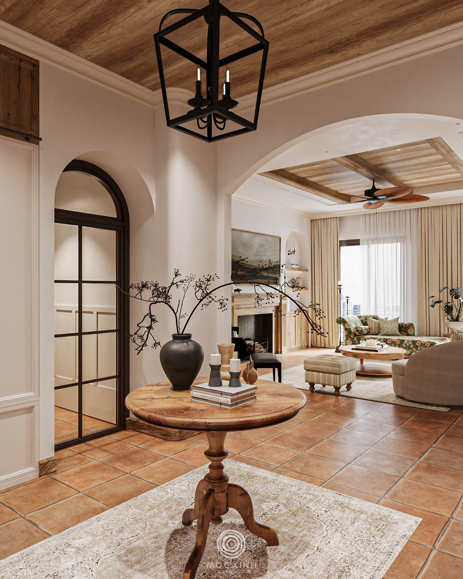 Phòng khách mang đậm phong cách Farmhouse với sự kết hợp hài hòa giữa các yếu tố mộc mạc. Trần nhà ốp gỗ thô mộc cùng quạt trần lá cọ tạo điểm nhấn tự nhiên, trong khi cửa sổ lớn cho phép ánh sáng tràn ngập không gian, đem đến bầu không khí ấm cúng đặc trưng.