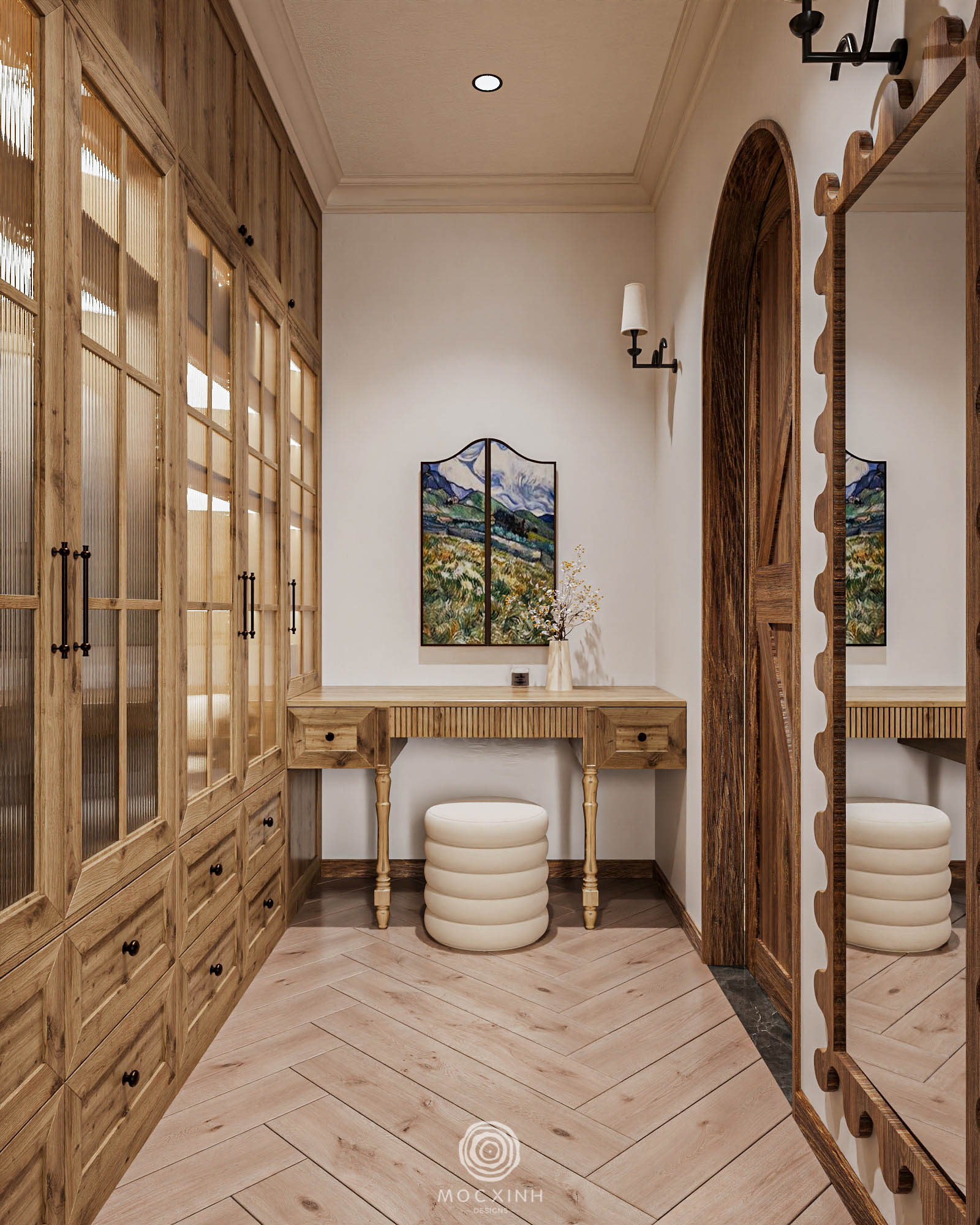 Bên cạnh yếu tố thẩm mỹ, khu vực này còn được chú trọng về mặt công năng với hệ tủ giày kết hợp ghế ngồi thay giày tiện dụng. Những chi tiết tone màu xanh lá đậm trở thành điểm nhấn tinh tế trên nền tường trắng ấm áp. Tất cả hòa quyện đem đến một không gian đón tiếp sang trọng mà vẫn gần gũi, thể hiện rõ nét phong cách Farmhouse hiện đại.