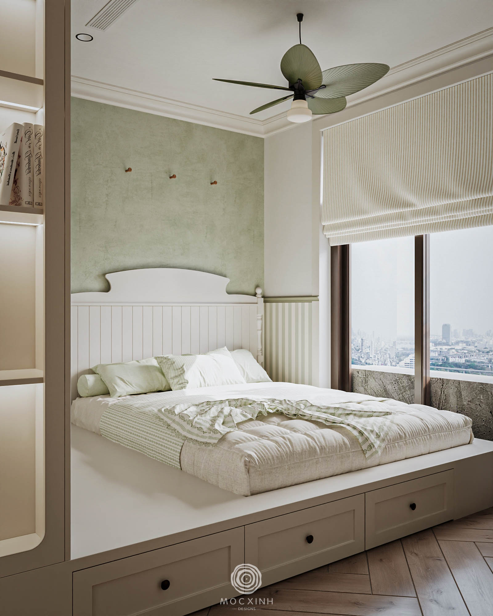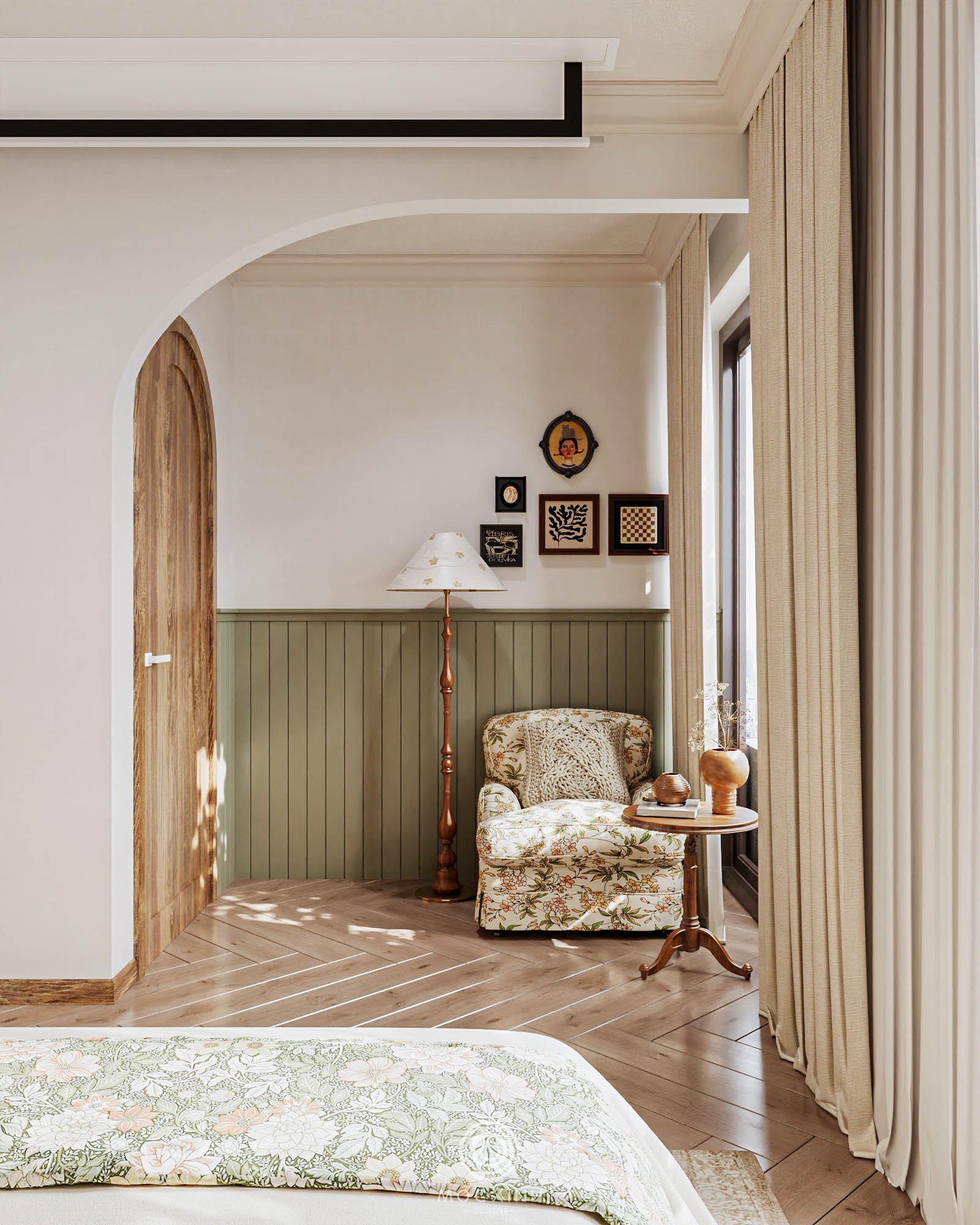 Căn phòng mang đậm phong cách cổ điển với những đường nét cong lượn mềm mại. Tông màu xanh lá cây nhạt chủ đạo kết hợp hài hòa với màu nâu trầm của gỗ, đem đến một không gian ấm cúng và thư thái.