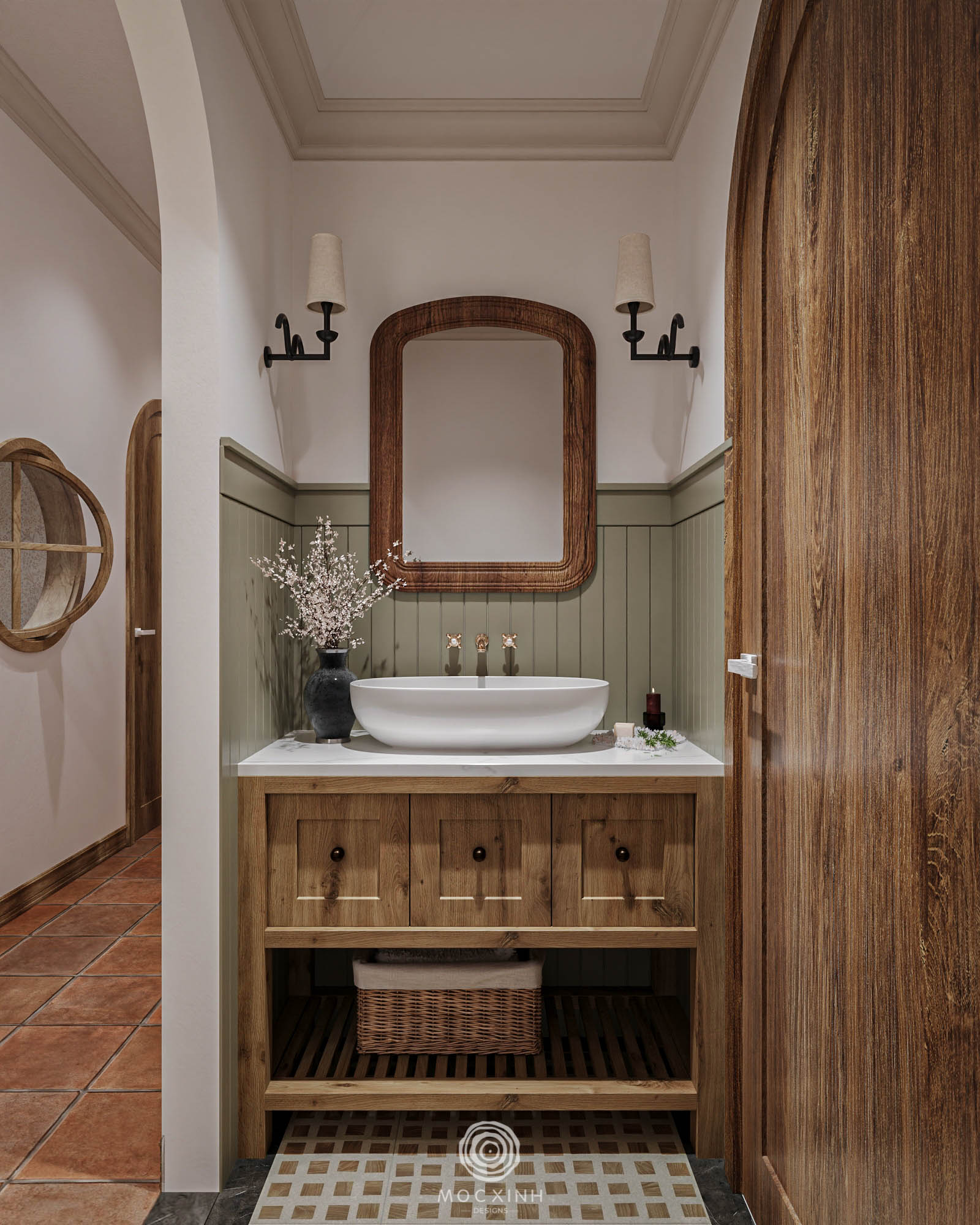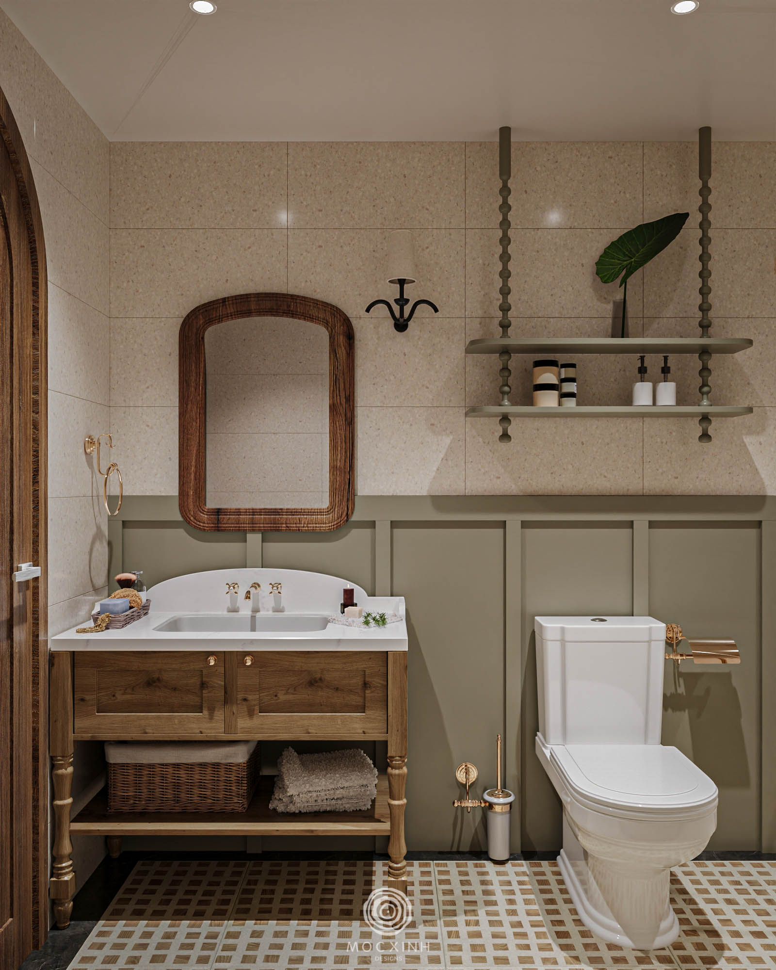 Các không gian khác như phòng ngủ và nhà vệ sinh được thiết kế theo phong cách farmhouse mang lại cảm giác ấm áp và gần gũi, kết hợp giữa vật liệu tự nhiên và màu sắc nhẹ nhàng.