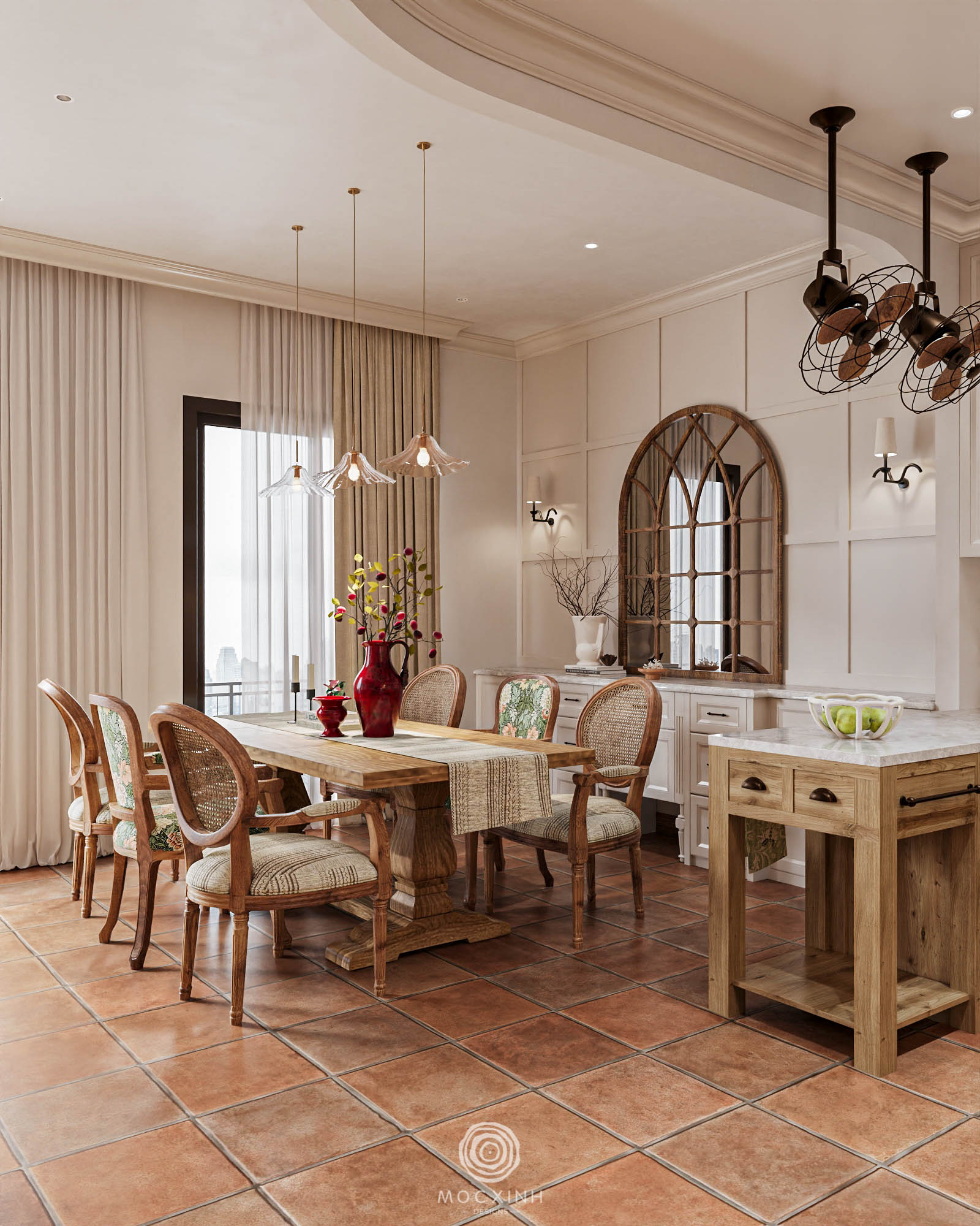 Khu vực bếp và phòng ăn được khéo léo bố trí với bàn đảo bếp tiện dụng hài hòa cùng khu vực bàn ăn. Điểm đặc biệt là bộ bàn ăn được làm từ gỗ mộc mạc, kết hợp cùng những ghế có kiểu dáng đơn giản với phần tựa đan mây thanh lịch.