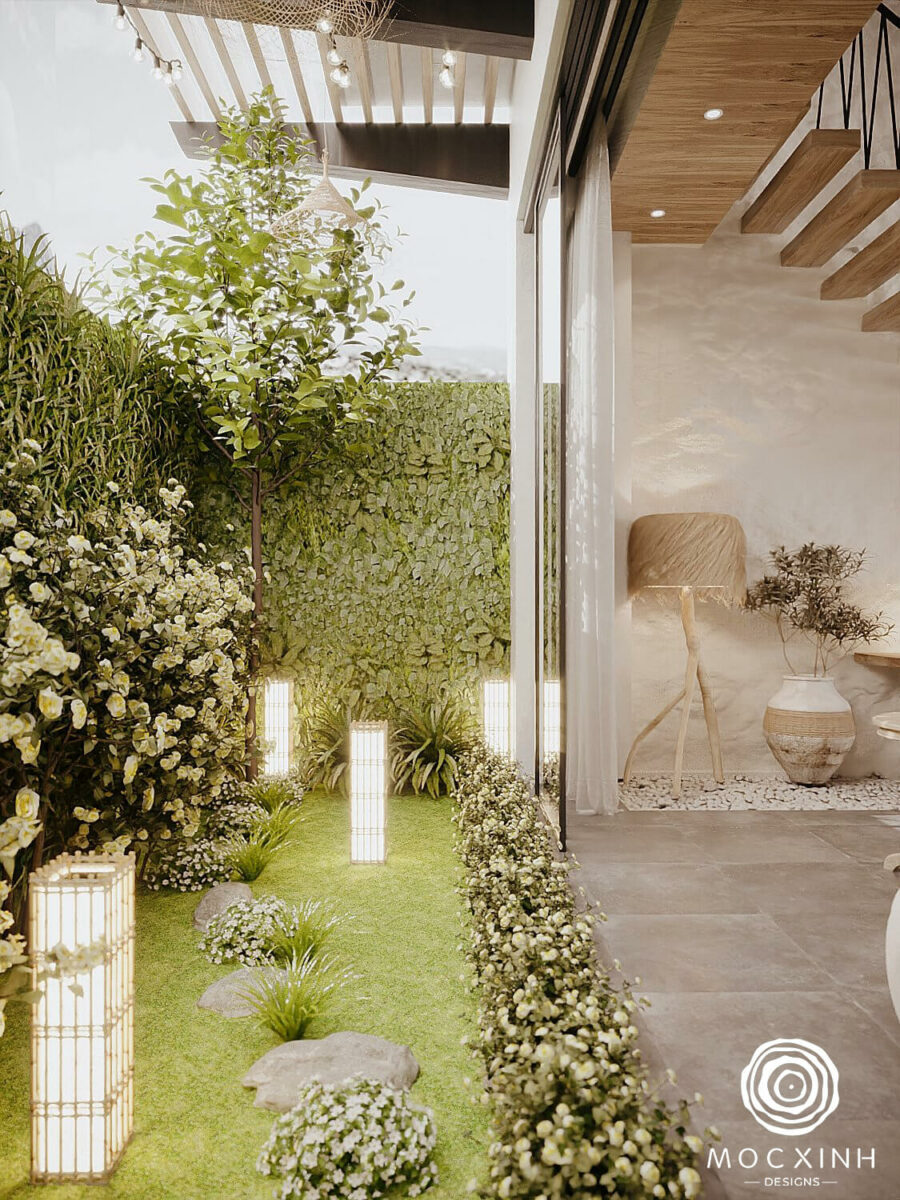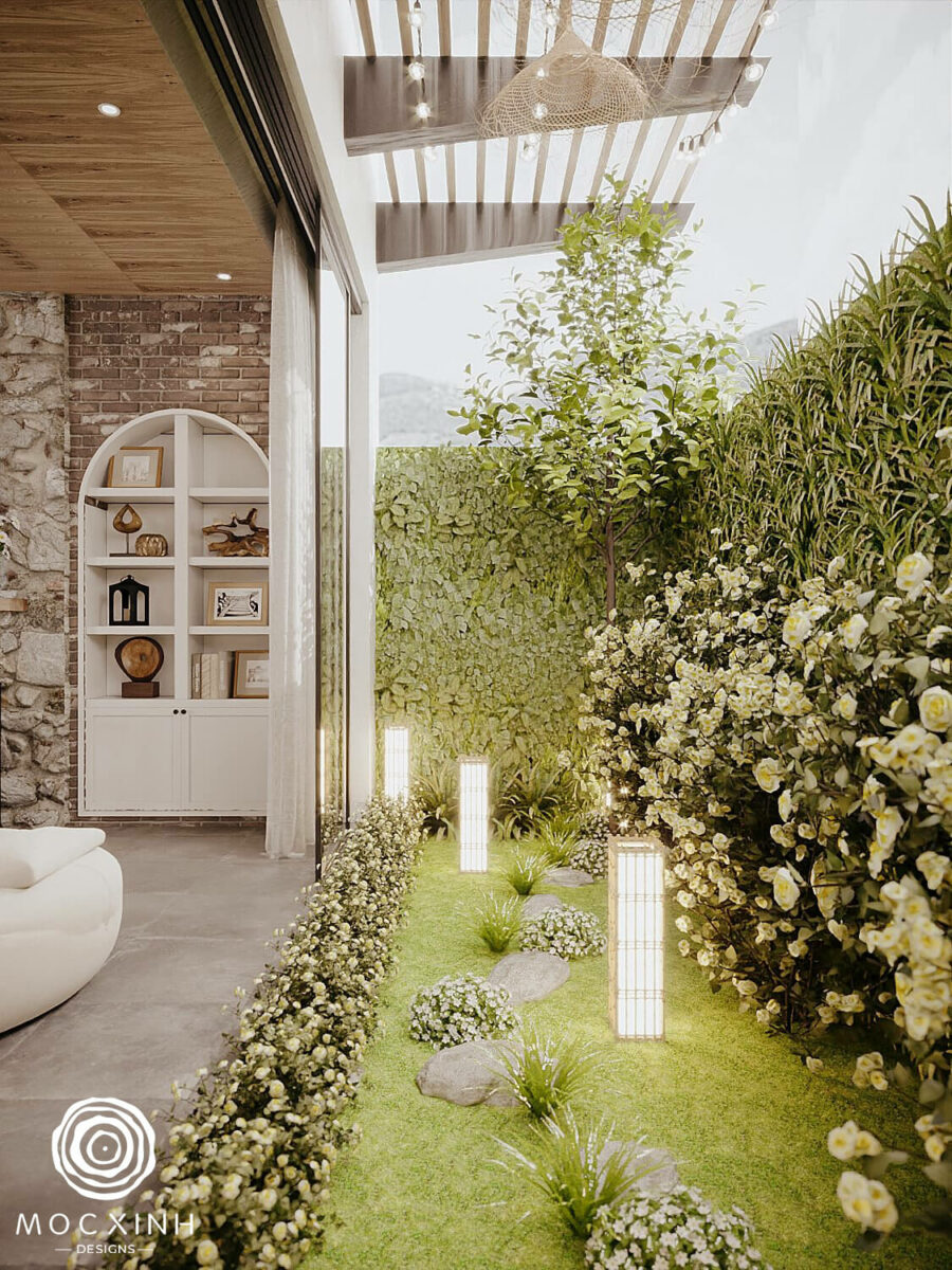 Kết hợp cùng tiểu cảnh với thật nhiều cỏ và hoa như một khu vườn nhỏ được đặt trước hiên nhà. Thật tuyệt khi mỗi ngày thức dậy ta ta lại được thấy mình đang ở trong không gian với ánh nắng ngập tràn, hít thở luồng không khí tươi mới để bắt đầu một ngày thật sảng khoái.