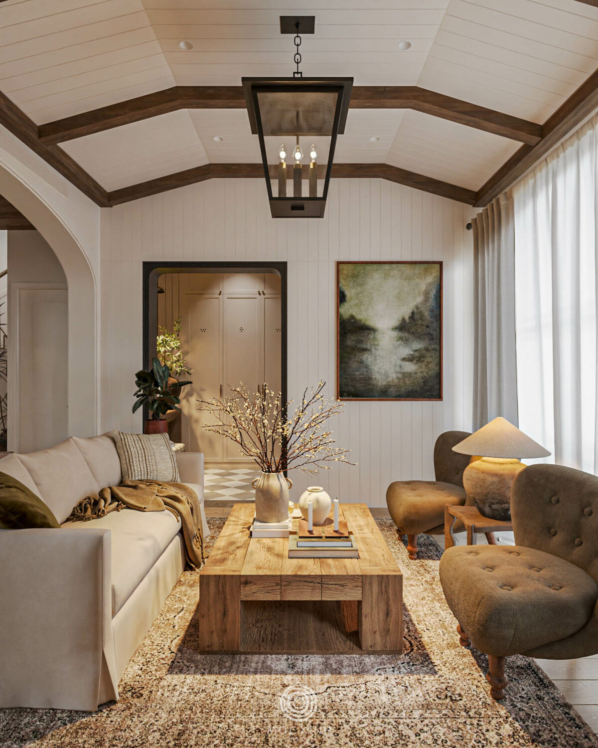 Cùng với đó, cảm giác về chiều sâu, sự ấm cúng và kết nối được tạo nên từ cách sắp đặt các chi tiết thiết kế và cân bằng hiện đại với truyền thống. Dễ thấy là trần ốp gỗ, ánh sáng vàng và ánh sáng tự nhiên ấm cúng nhẹ nhàng, nội thất mềm mại êm ái hoặc thô mộc, mô hình lò sưởi ở phòng khách, các họa tiết cổ điển trên đồ decor,… Sâu sắc hơn là cách phân chia tinh tế các khu công năng, việc giữ không gian riêng cho việc thờ cúng truyền thống, hay thêm vào yếu tố phong thủy non bộ ở mặt tiền mặt đứng hóa giải đường nội khu đâm một phần vào cửa nhà.