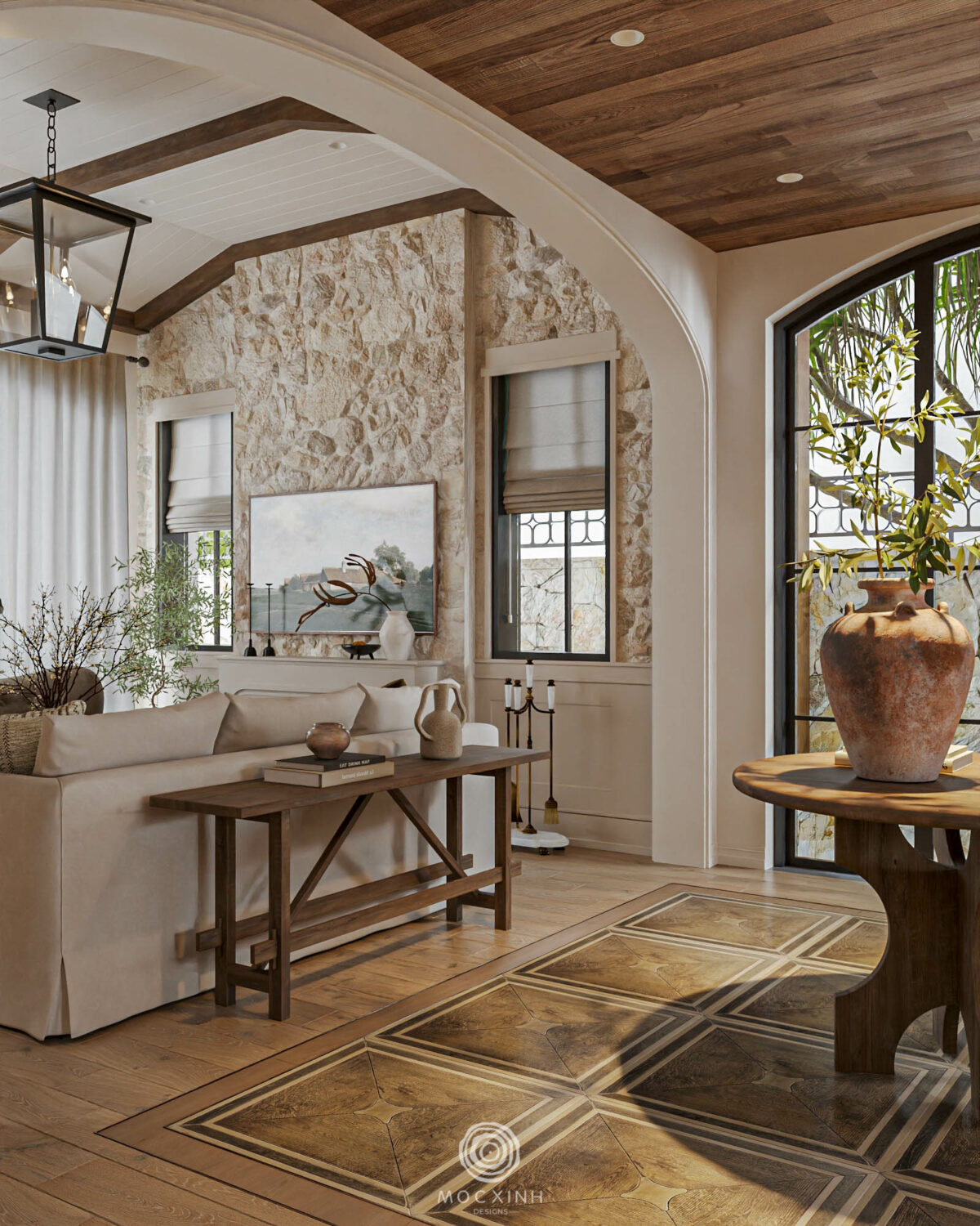 Cảm giác về không gian sống rộng rãi, tiện nghi và chân thật được thể hiện qua không gian rộng rãi, giao hòa với thiên nhiên, những bức tường lát đá thô, những đường cong nơi vòm cửa, những ô cửa sổ kính lớn, màu sắc chủ đạo trắng kem + màu gỗ mộc. Hoặc cũng có thể cảm nhận thông qua sự xuất hiện của nội thất gỗ, thảm dệt, kim loại thô, chất liệu gốm sứ, mây tre,…