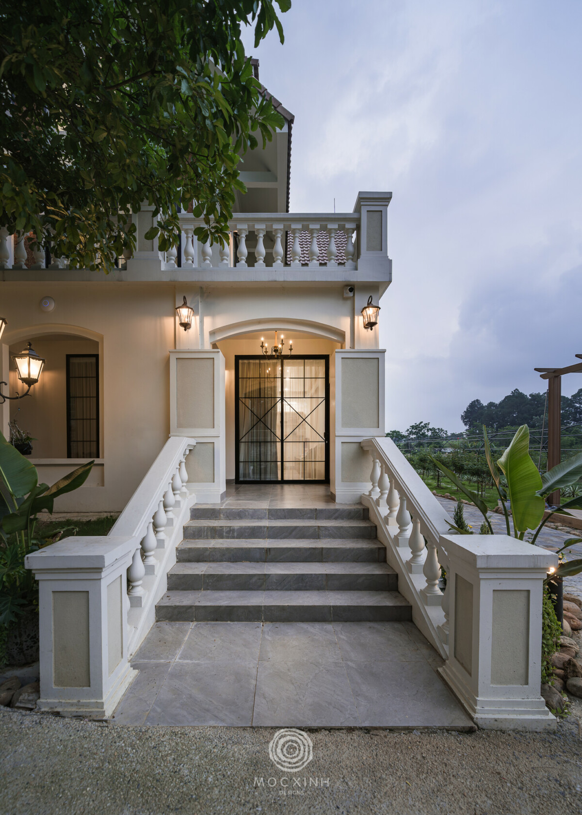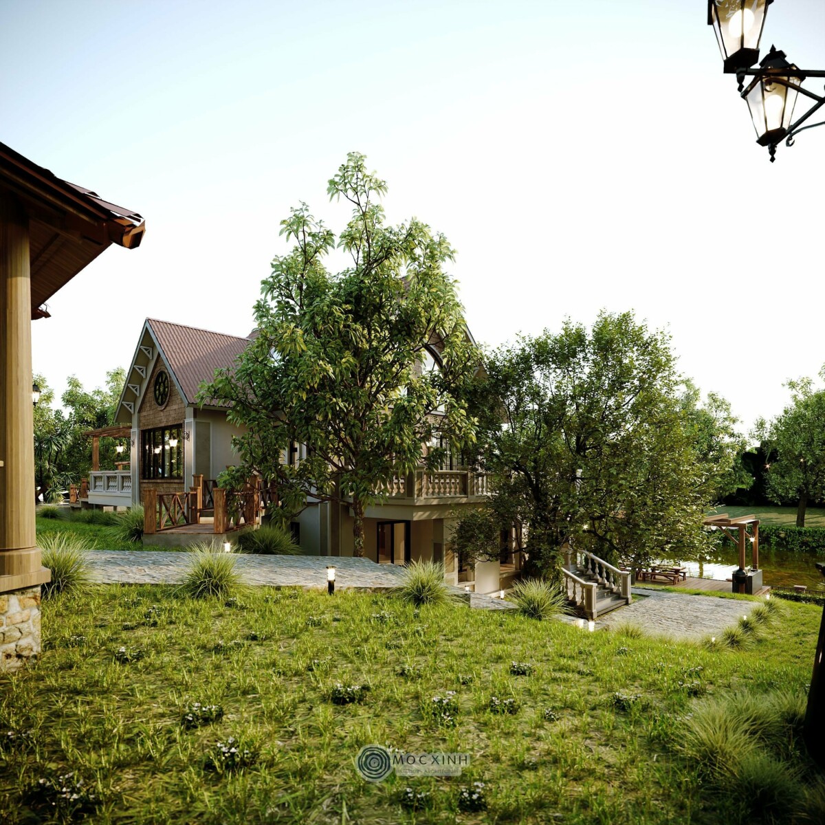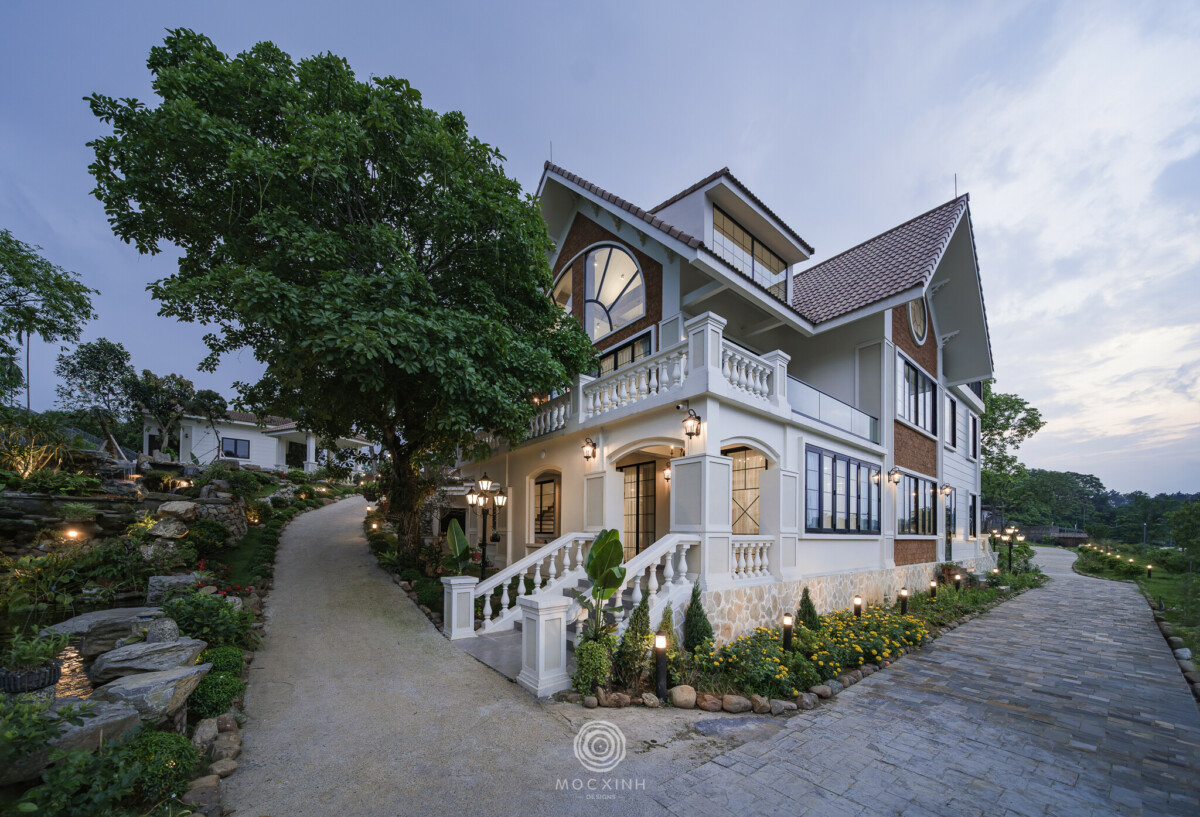 Nằm trong vùng địa hình đồi núi, kiến trúc cần phải tương tác với địa mạo, chứ không thể tách rời. Vì vậy, thay vì xây tường chắn hoặc hàng rào kín, Mộc Xinh dùng lối đi dạo, hàng hiên, mái che để định hình ranh giới mềm giữa trong và ngoài. Nhờ vậy, cảnh quan không chỉ là nền cho công trình mà nó trở thành một phần sống động của kiến trúc.