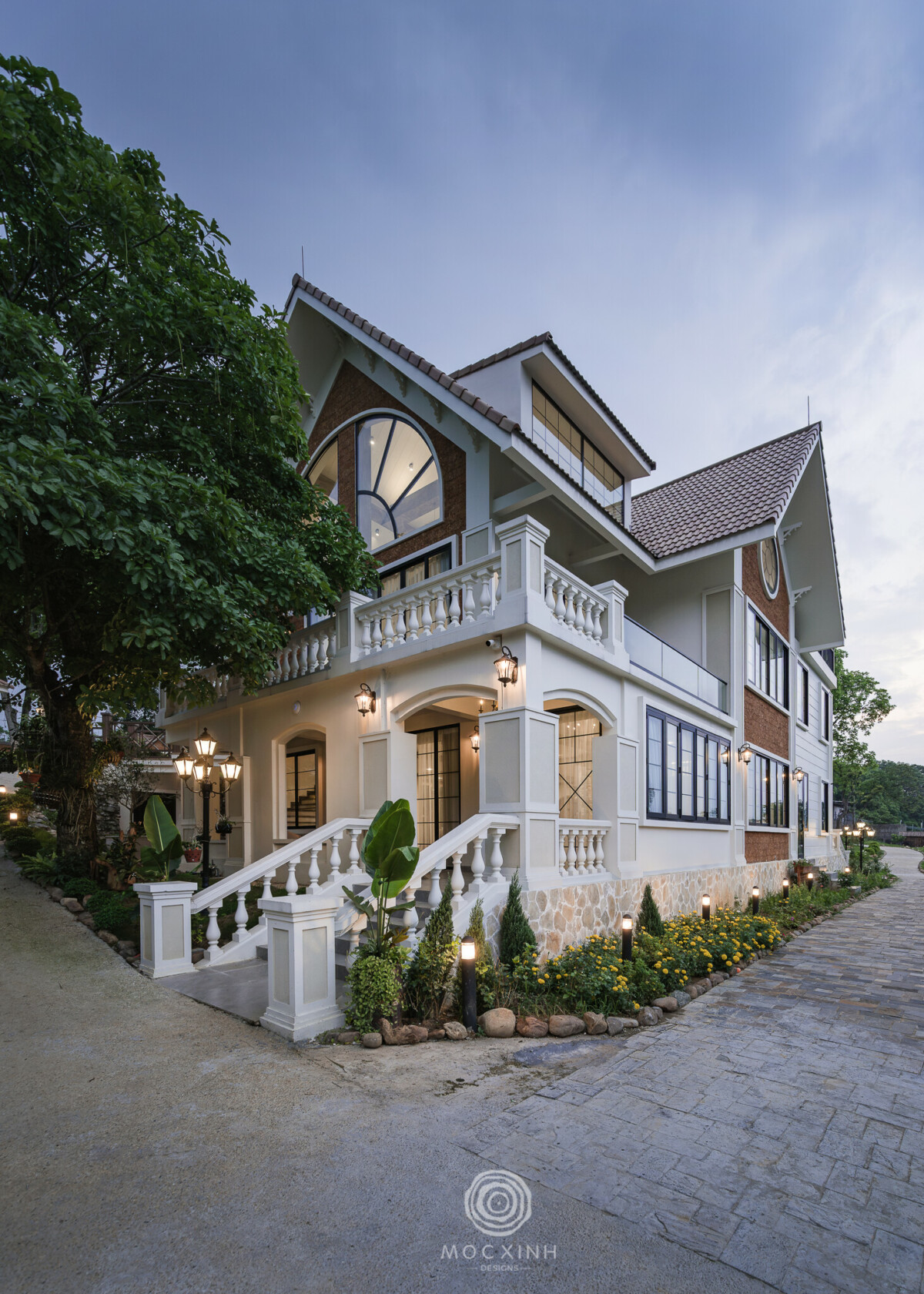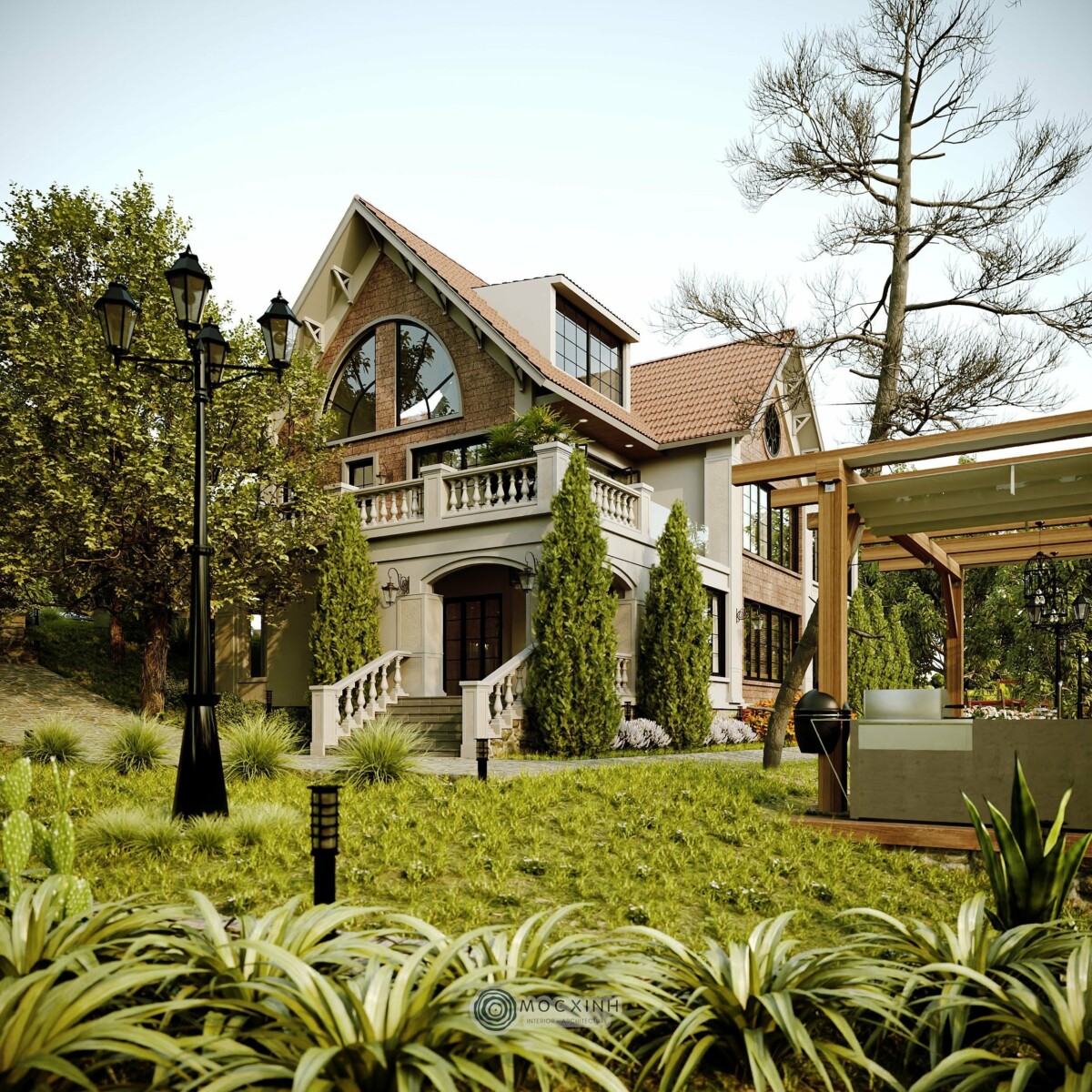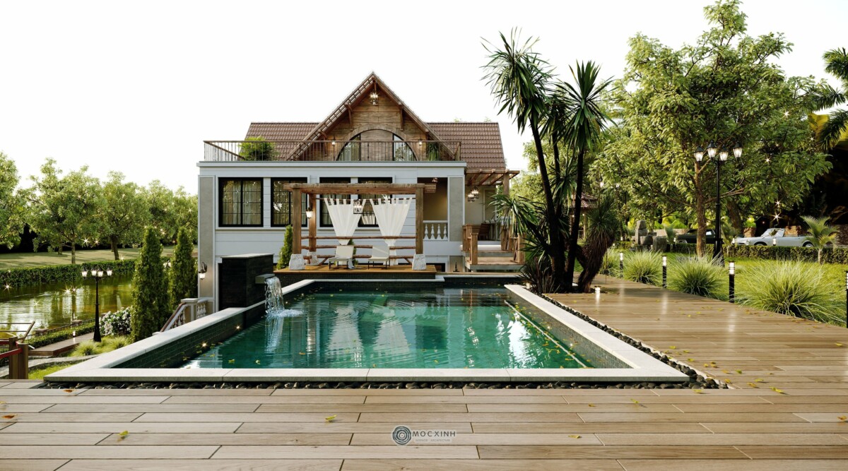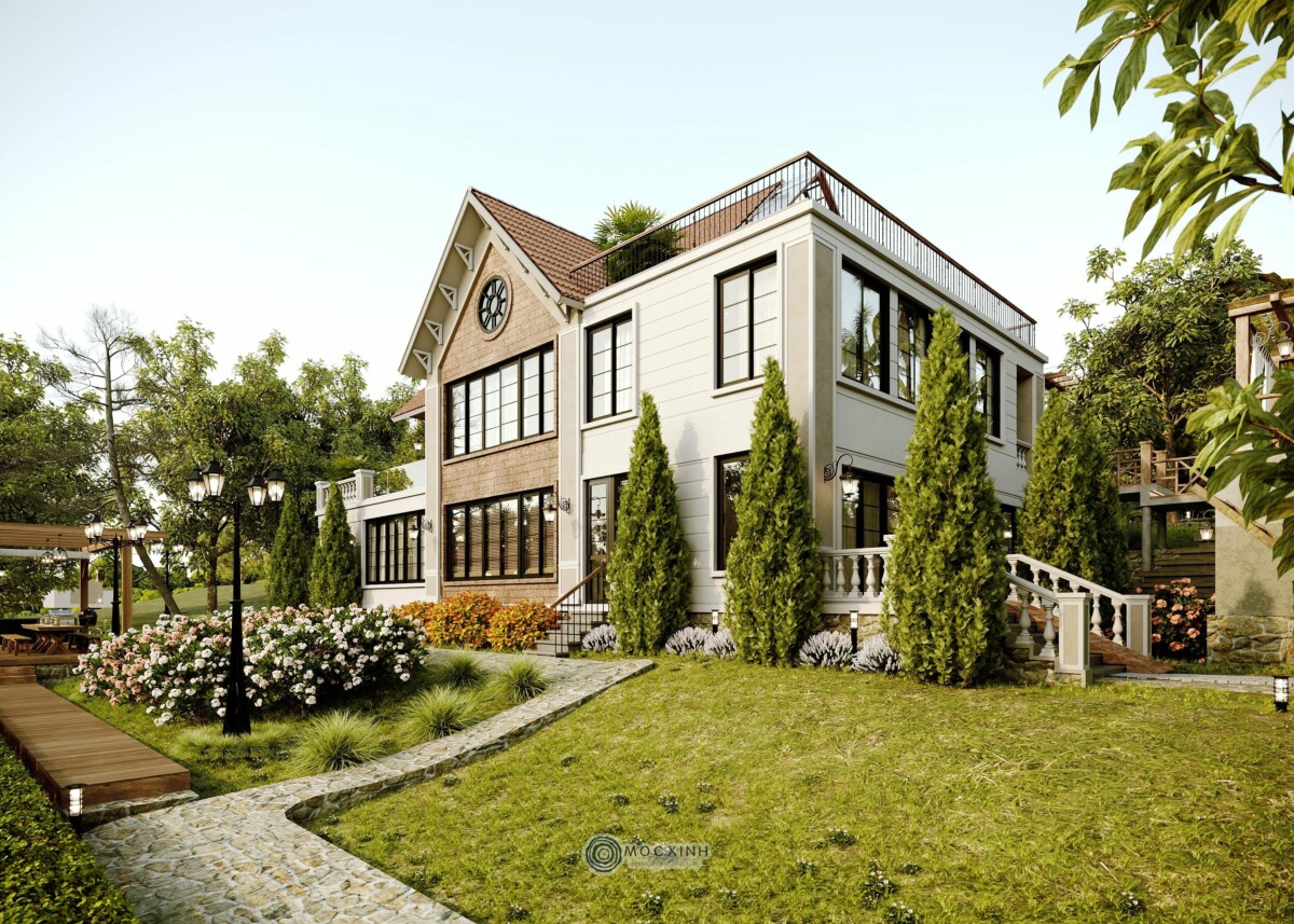 Nằm trong vùng địa hình đồi núi, kiến trúc cần phải tương tác với địa mạo, chứ không thể tách rời. Vì vậy, thay vì xây tường chắn hoặc hàng rào kín, Mộc Xinh dùng lối đi dạo, hàng hiên, mái che để định hình ranh giới mềm giữa trong và ngoài. Nhờ vậy, cảnh quan không chỉ là nền cho công trình mà nó trở thành một phần sống động của kiến trúc.