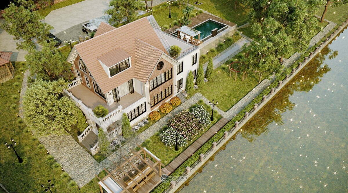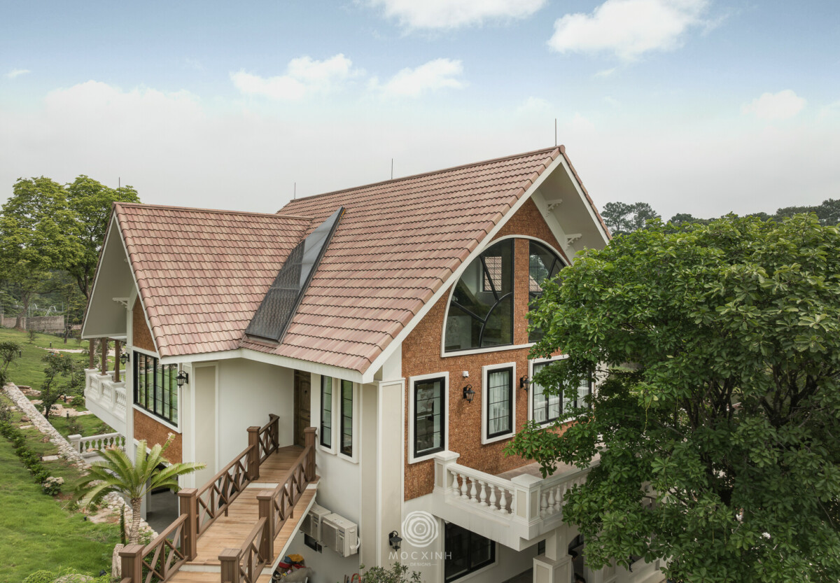 Mặt khác, sự chênh lệch độ cao địa hình cũng mở ra một cơ hội mới là đón cảnh quan theo nhiều lớp. Để khai thác tối đa được vẻ đẹp nguyên sơ của hồ nước, đồi thông và nông trường, Mộc Xinh cũng quyết định thực hiện một giải pháp thiết kế khá táo bạo là cắt bỏ một phần mái cũ và ghép nối hai khối mái mới vuông góc để mở rộng diện tích sàn từ 100m2/sàn lên 200m2/sàn. Các không gian sinh hoạt chính đều được mở tầm nhìn về hồ và các khu vực trồng cây lâu năm.