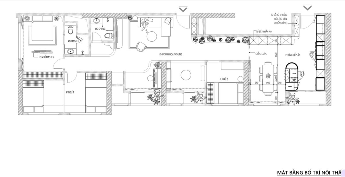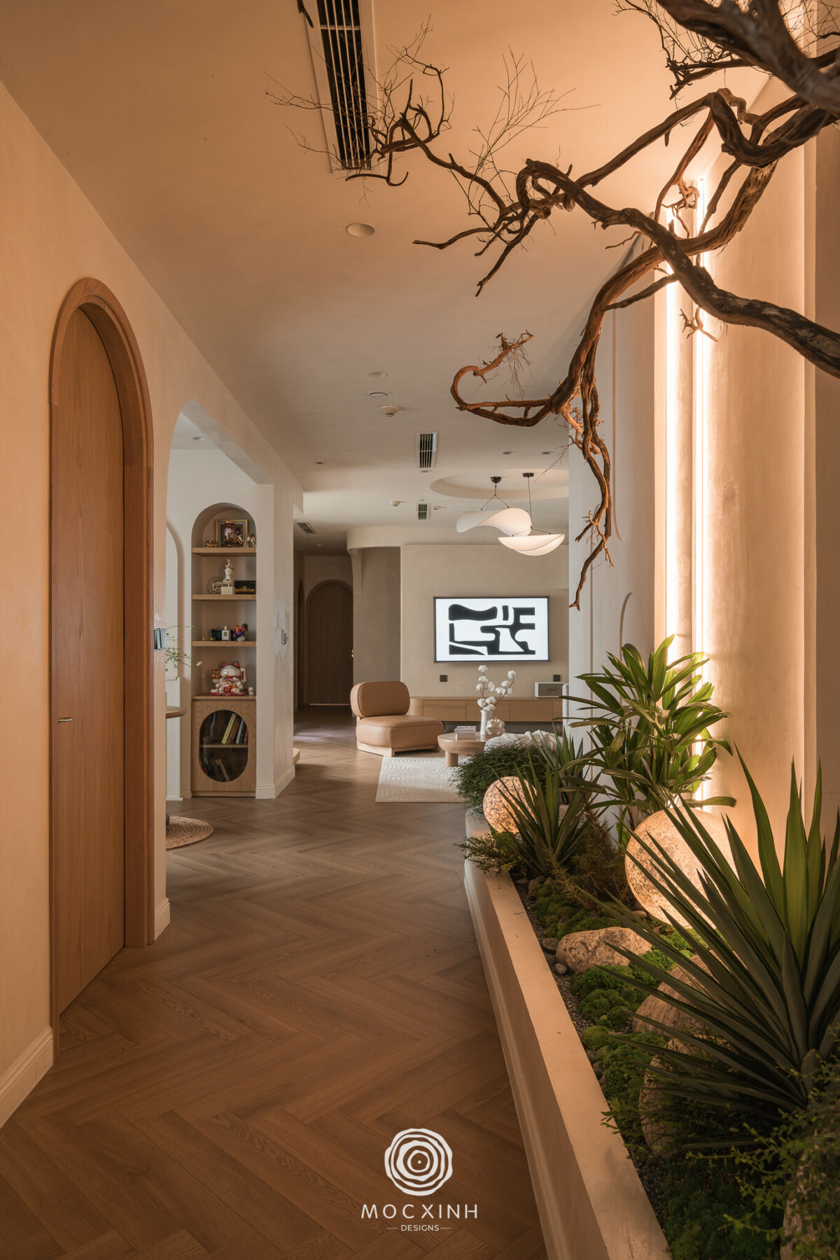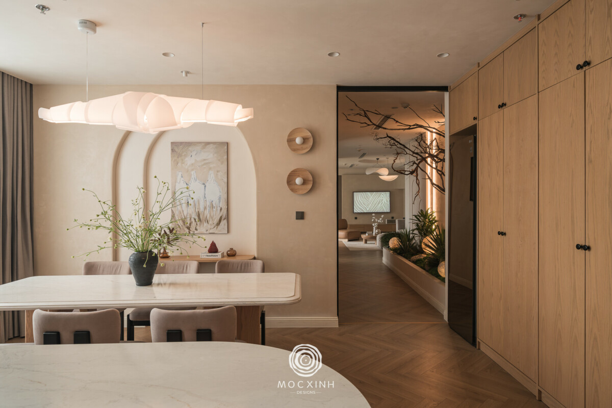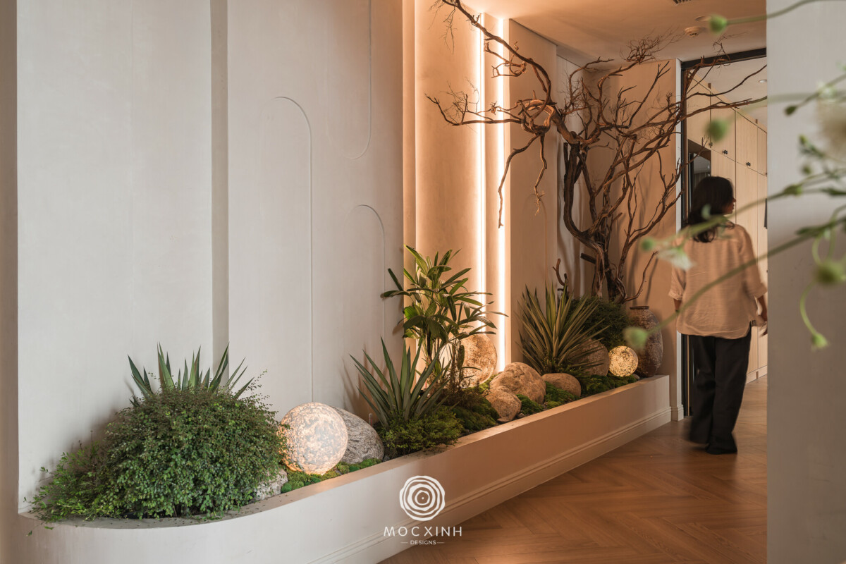 Đặc biệt, hành lang liên thông, yếu tố then chốt kết nối phòng khách và bếp được xử lý như một “trục không gian” với tiểu cảnh vườn khô là điểm nhấn tạo bản sắc cho toàn bộ căn hộ. Việc đảm bảo cao độ sàn, hệ chiếu sáng, vị trí kỹ thuật và lớp hoàn thiện đồng bộ đòi hỏi sự phối hợp liên tục giữa hai đơn vị nhằm giữ cho trục giao thông này đạt đúng tinh thần ban đầu.
