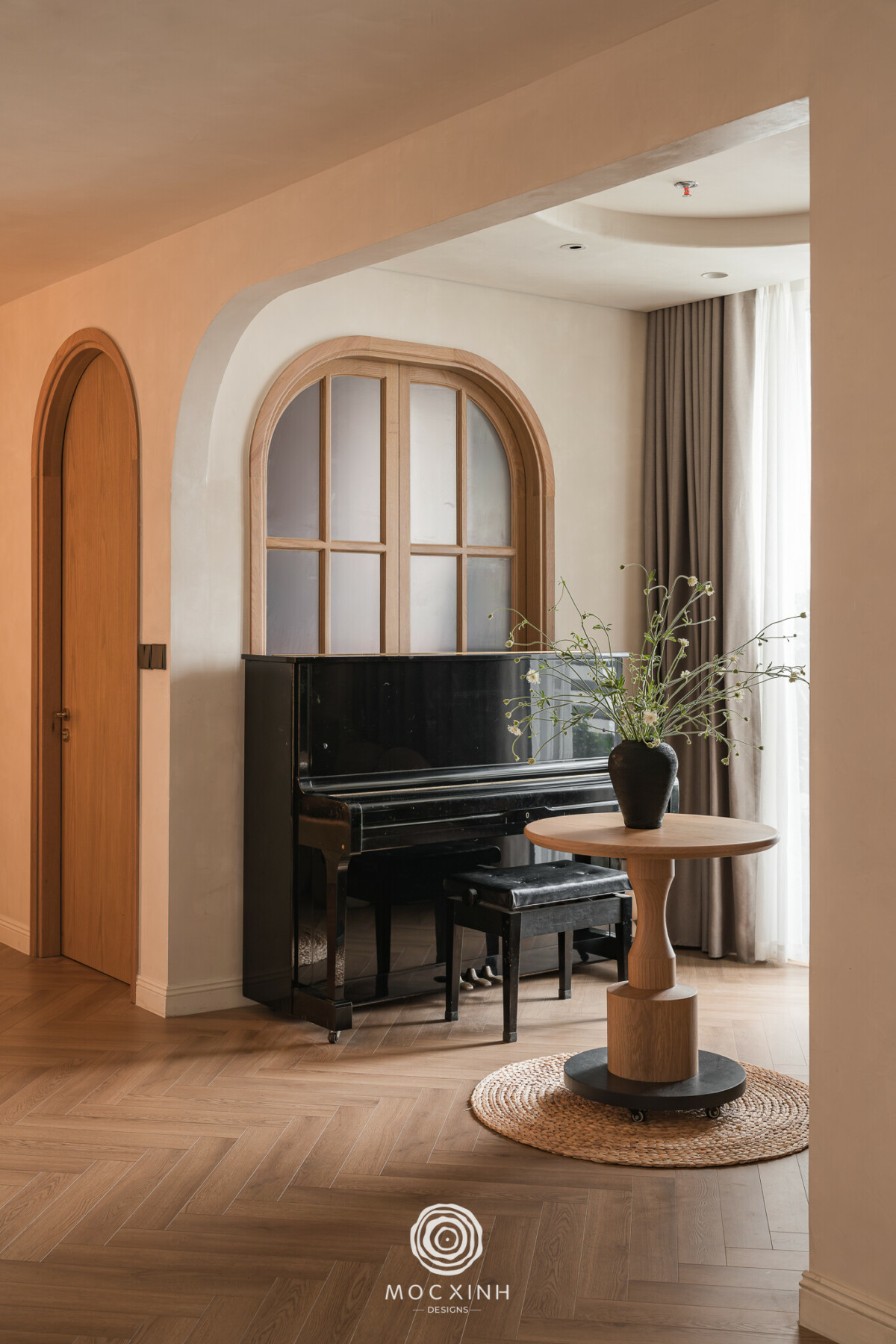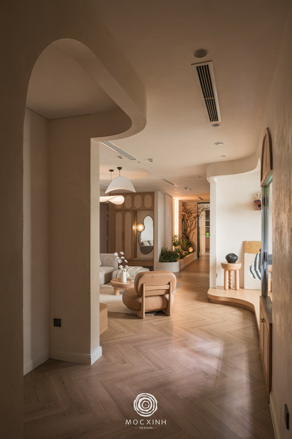 Quyết định đầu tiên là đánh giá lại toàn bộ phần thô đã và đang thi công. Mộc Xinh rà soát cao độ, trục giao thông, kích thước thông thủy, vị trí kỹ thuật và những điểm có nguy cơ tạo góc chết khi hoàn thiện. Những chi tiết không phù hợp được tinh chỉnh trong phạm vi cho phép của khung sườn cũ, nhằm bảo toàn tiến độ và tránh phát sinh thủ tục pháp lý. Việc giữ lại “xương sống” của layout trước đó là lựa chọn chiến lược để Mộc Xinh kiểm soát rủi ro và tái tổ chức không gian bằng giải pháp chi tiết.