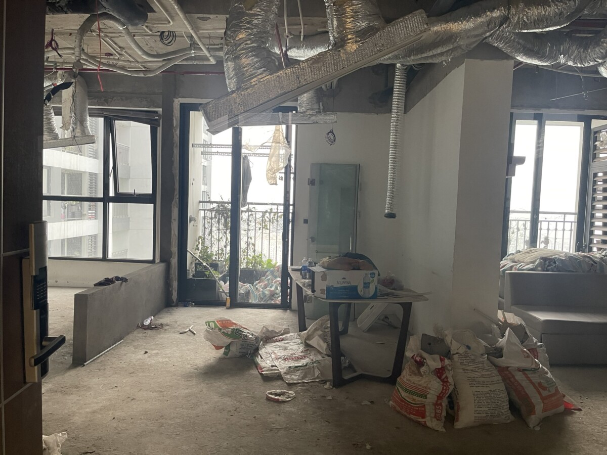 Căn hộ 175m² tại Vinhomes Green Bay bắt đầu từ hai mặt bằng nguyên bản của chủ đầu tư, với hai cửa vào cách xa nhau và hệ vách bê tông – cột chịu lực chia cắt không gian. Gia chủ đã làm việc với một đơn vị trước đó và chốt phương án layout cải tạo, đồng thời triển khai một phần thi công phá dỡ. Khi Mộc Xinh tiếp nhận, công trình đã mở thông hai căn nhưng vẫn giữ nguyên trần thạch cao và các cấu phần cũ; phương án mặt bằng đã tồn tại và thủ tục pháp lý liên quan đến phòng cháy chữa cháy khiến việc thay đổi khung sườn trở nên áp lực về tiến độ và chi phí.