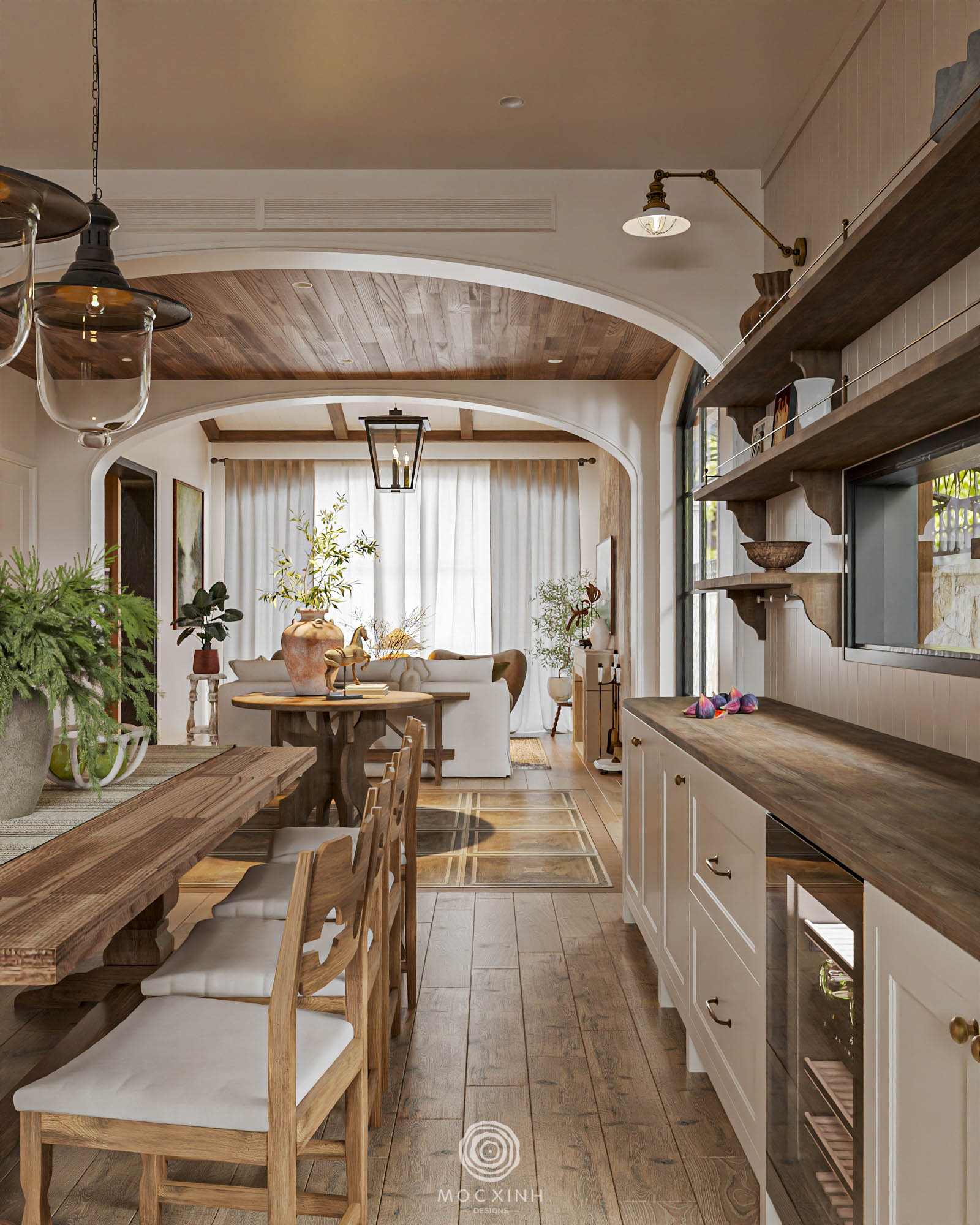 Phong cách Modern Farmhouse thường được hiểu qua hình ảnh bàn ăn gỗ rộng, chân thô, ghế mây đan hoặc vải dệt kẻ. Những yếu tố này đúng nhưng điều thiết kế tốt cần làm là kết nối chúng với cấu trúc nhà và cách sử dụng.
