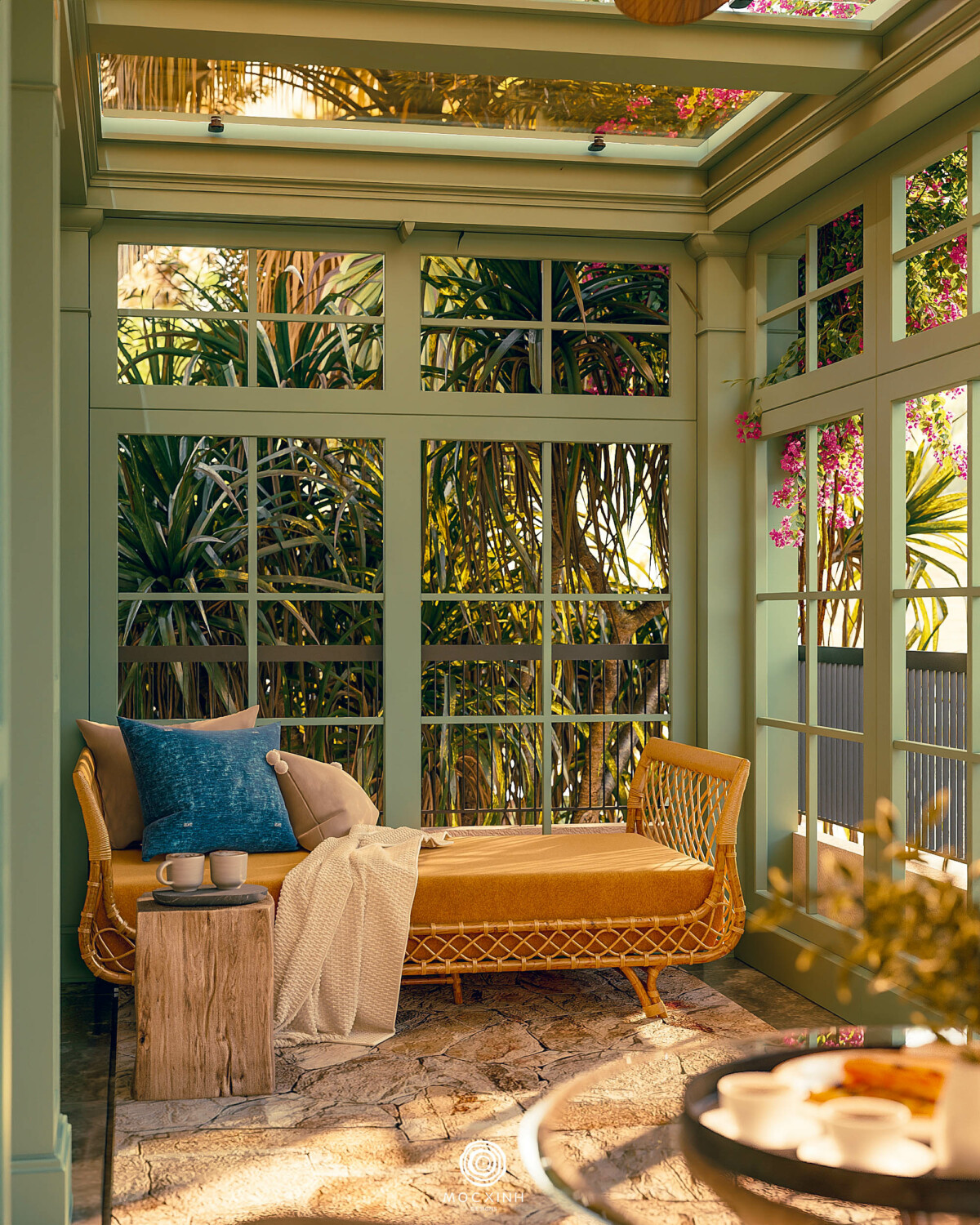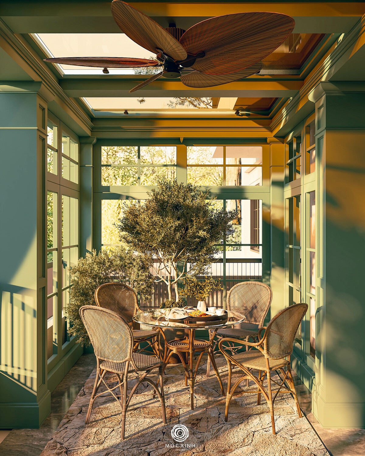 - Tối ưu ánh sáng tự nhiên: cửa lớn, hiên rộng, sàn cao giúp ánh sáng lan toả.