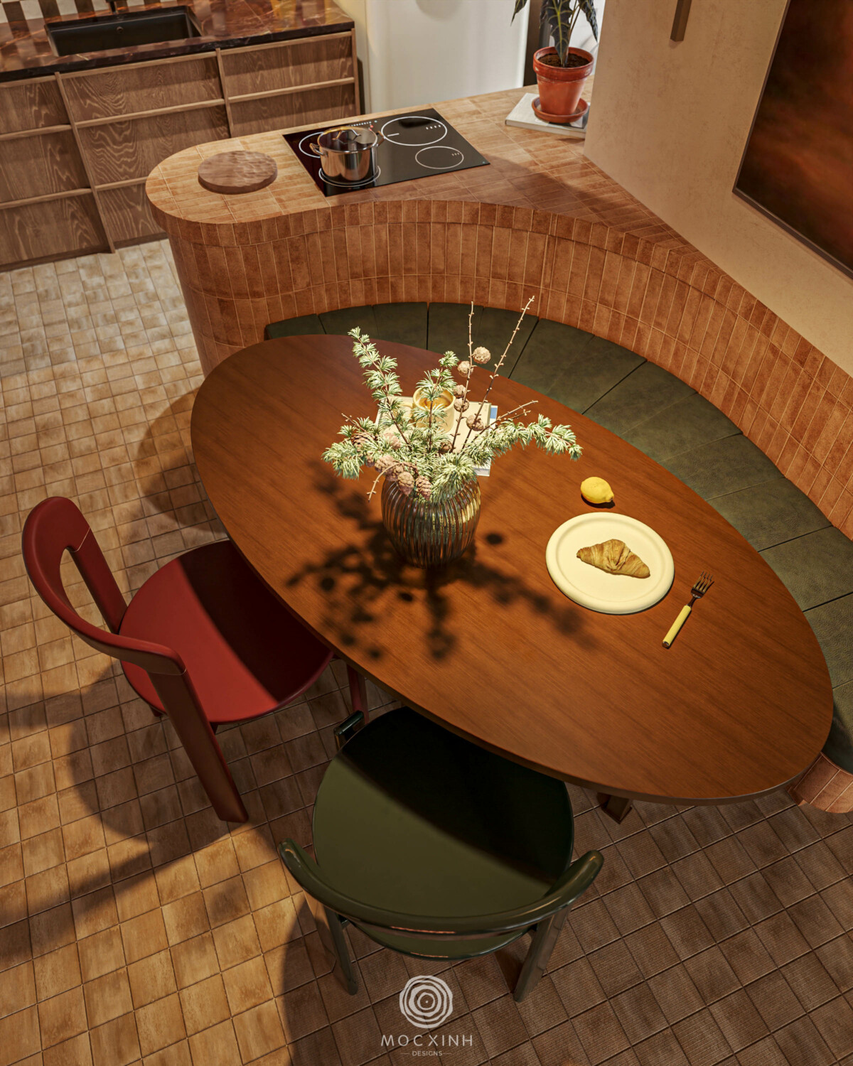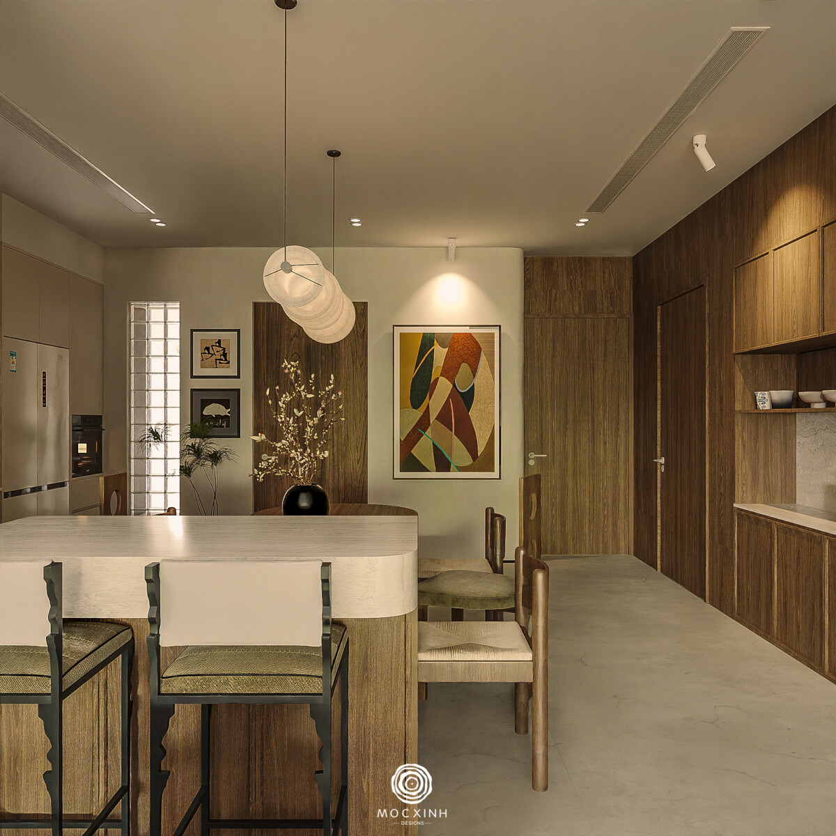 Các chi tiết như tay nắm, viền kim loại, đường nối vật liệu được thiết kế theo cùng một ngôn ngữ. Lớp hoàn thiện này đảm bảo sự nhất quán khi tiếp cận ở khoảng cách gần. Đây cũng là nguyên tắc cơ bản đầu tiên của Mộc Xinh khi thực hiện thiết kế – thi công các công trình dự án: Chất lượng đồng bộ, hoàn thiện đến cấp độ chi tiết.