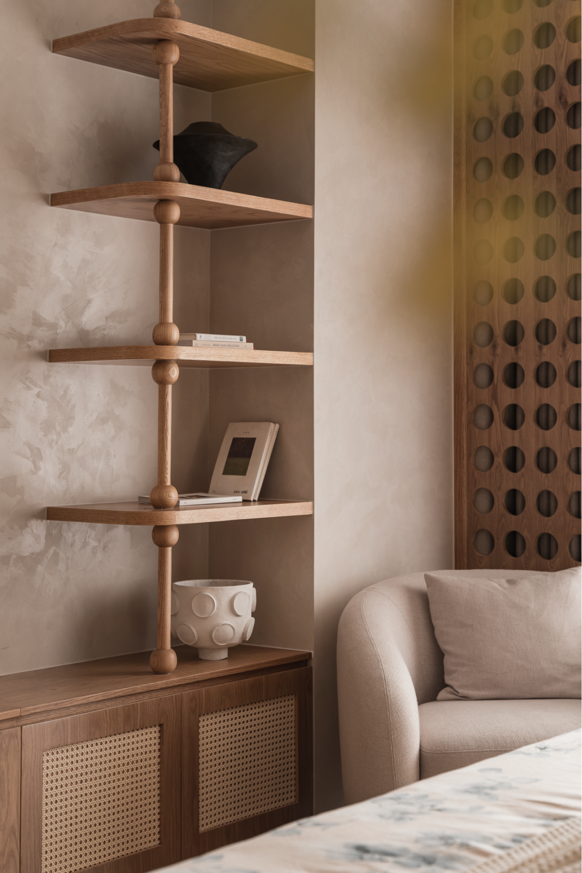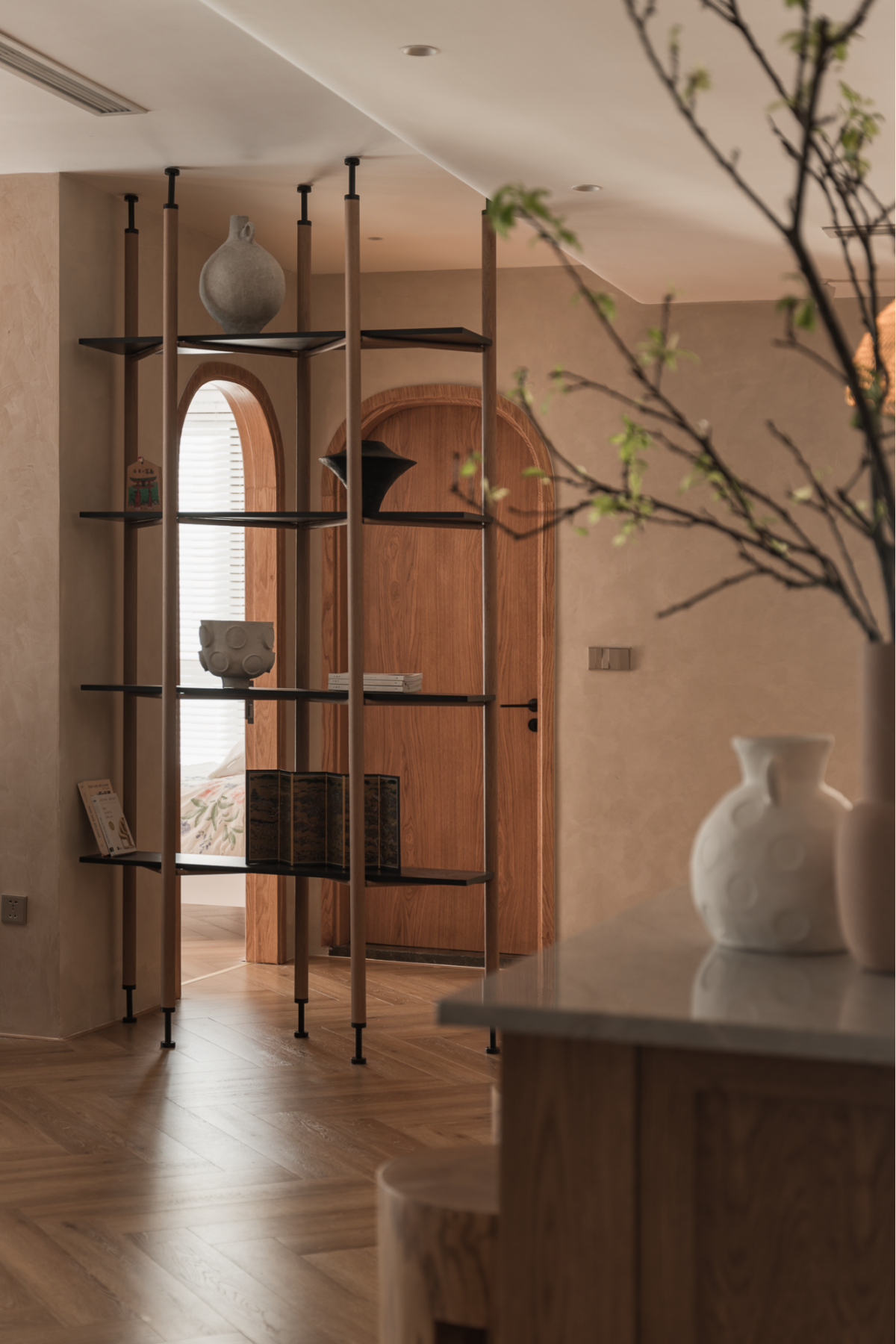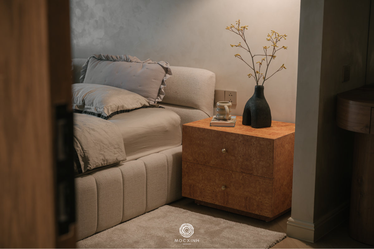 Một bức tường sáng màu làm nền cho đồ gỗ sẫm, đồ vật gam màu trung tính với bề mặt vải thô đặt cạnh gốm mịn, ánh sáng ấm lan nhẹ trên nền xi măng mát. Tất cả đều tạo nên sự khác biệt vừa đủ để không gian có chiều sâu mà vẫn giữ được cảm giác cân bằng.