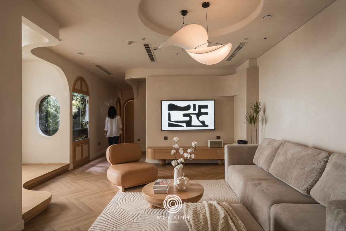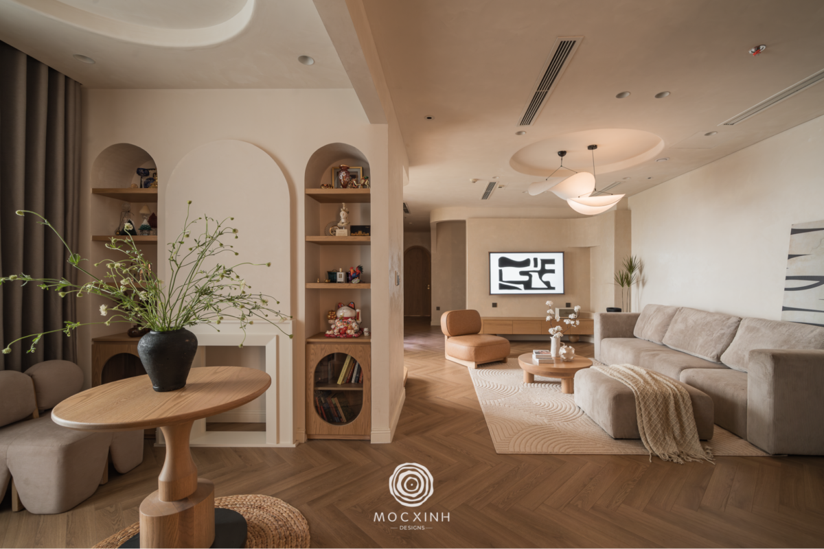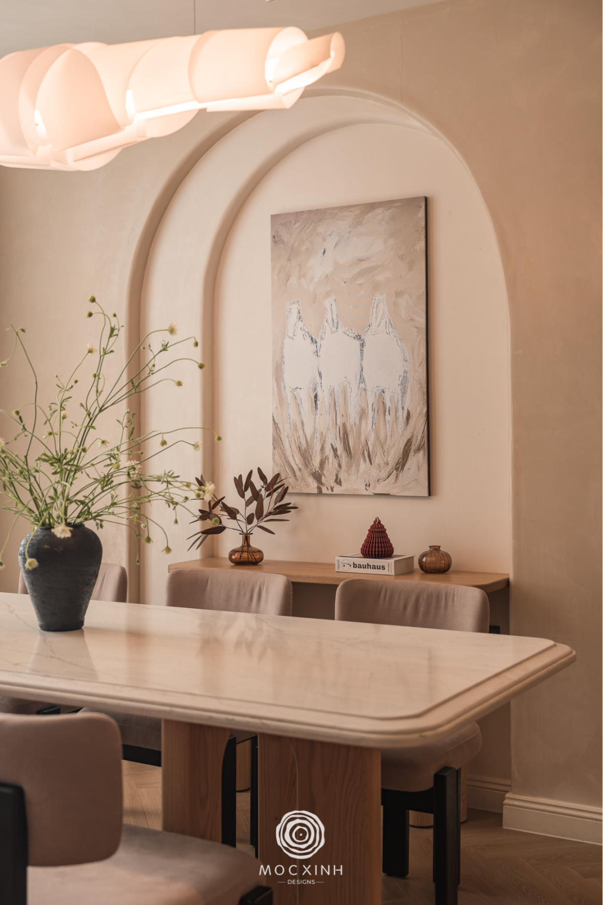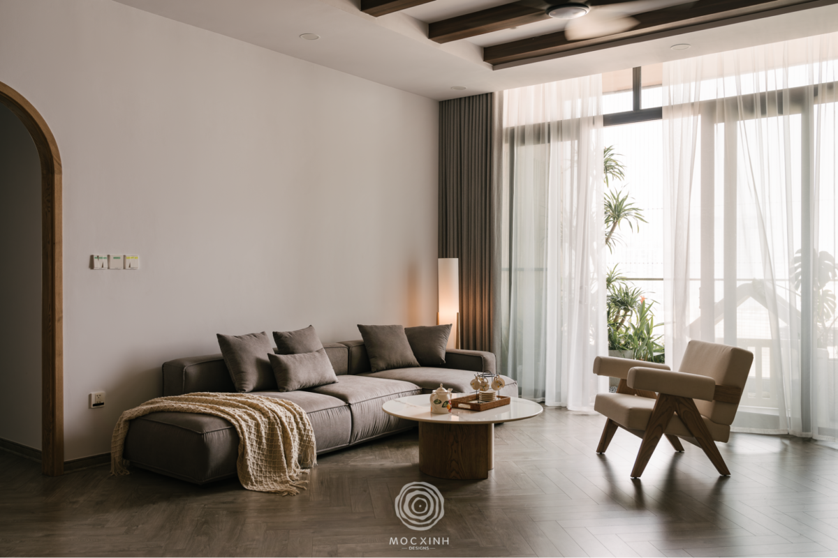 Trên nền dải màu trung tính đó, các món nội thất có tông sẫm hơn như gỗ tối màu, xám đậm hoặc đen mờ được đặt vào có chủ đích để tạo điểm nhấn. Những mảng màu trầm này không làm không gian nặng nề, mà đóng vai trò tạo chiều sâu thị giác, giúp bố cục trở nên rõ ràng và có độ sâu hơn cho không gian.