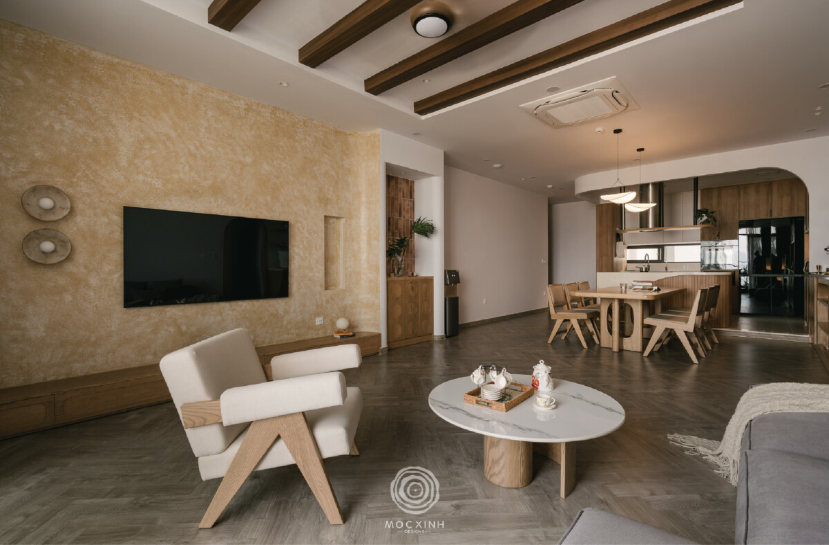 Trên nền dải màu trung tính đó, các món nội thất có tông sẫm hơn như gỗ tối màu, xám đậm hoặc đen mờ được đặt vào có chủ đích để tạo điểm nhấn. Những mảng màu trầm này không làm không gian nặng nề, mà đóng vai trò tạo chiều sâu thị giác, giúp bố cục trở nên rõ ràng và có độ sâu hơn cho không gian.