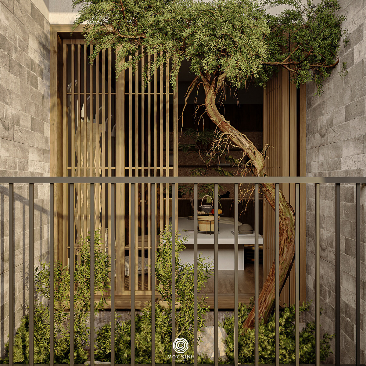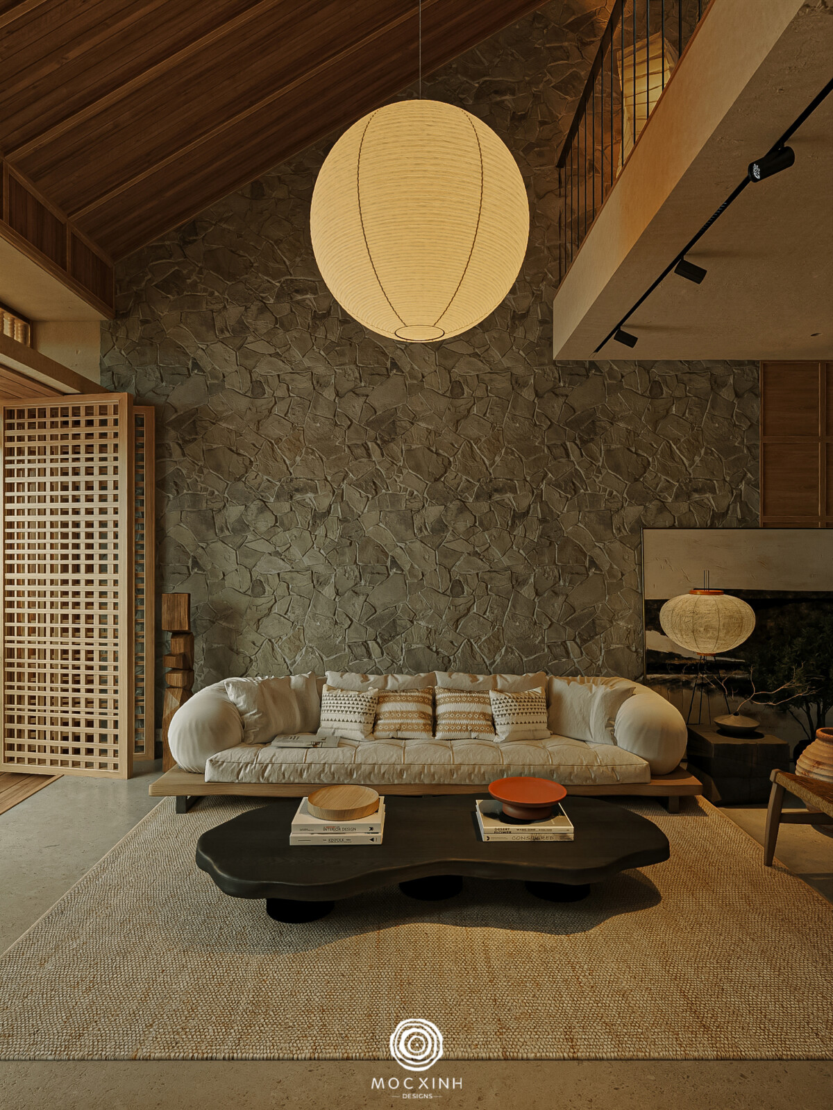 “Ma” (間 – Gian) là triết lý thẩm mỹ Nhật Bản về “khoảng trống” ý nghĩa, không chỉ là không gian vật lý rỗng mà là sự ngưng nghỉ, khoảng lặng giữa các vật thể, âm thanh hay thời gian. Nó tạo ra sự cân bằng, nhịp điệu và tôn lên vẻ đẹp của sự tinh tế, “trống mà không rỗng” trong kiến trúc, nội thất và nghệ thuật. Khoảng trống là điều cần thiết nhưng Mộc Xinh không đẩy không gian về mức quá trống hoặc quá trầm. Mục tiêu là tạo sự cân bằng, nơi con người có thể nghỉ mà không bị tách rời khỏi đời sống sinh hoạt.
