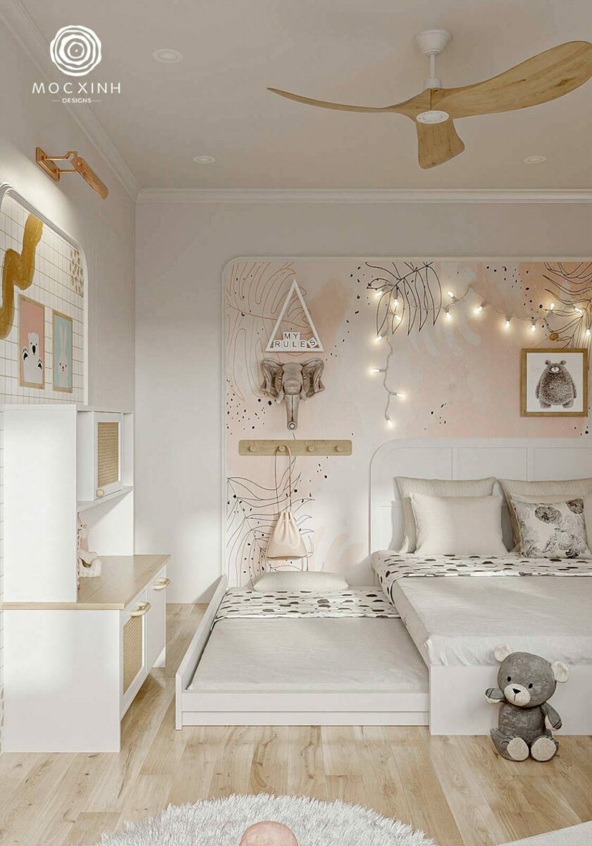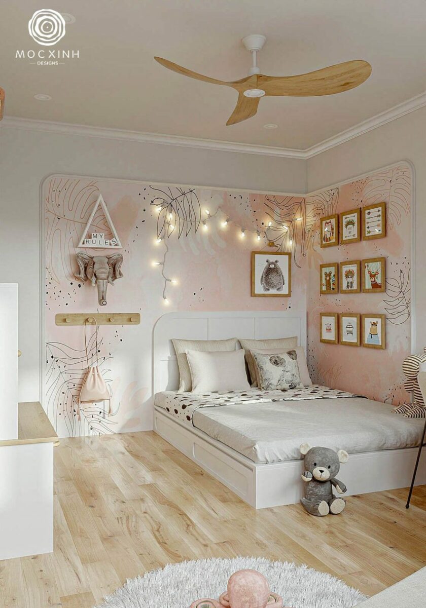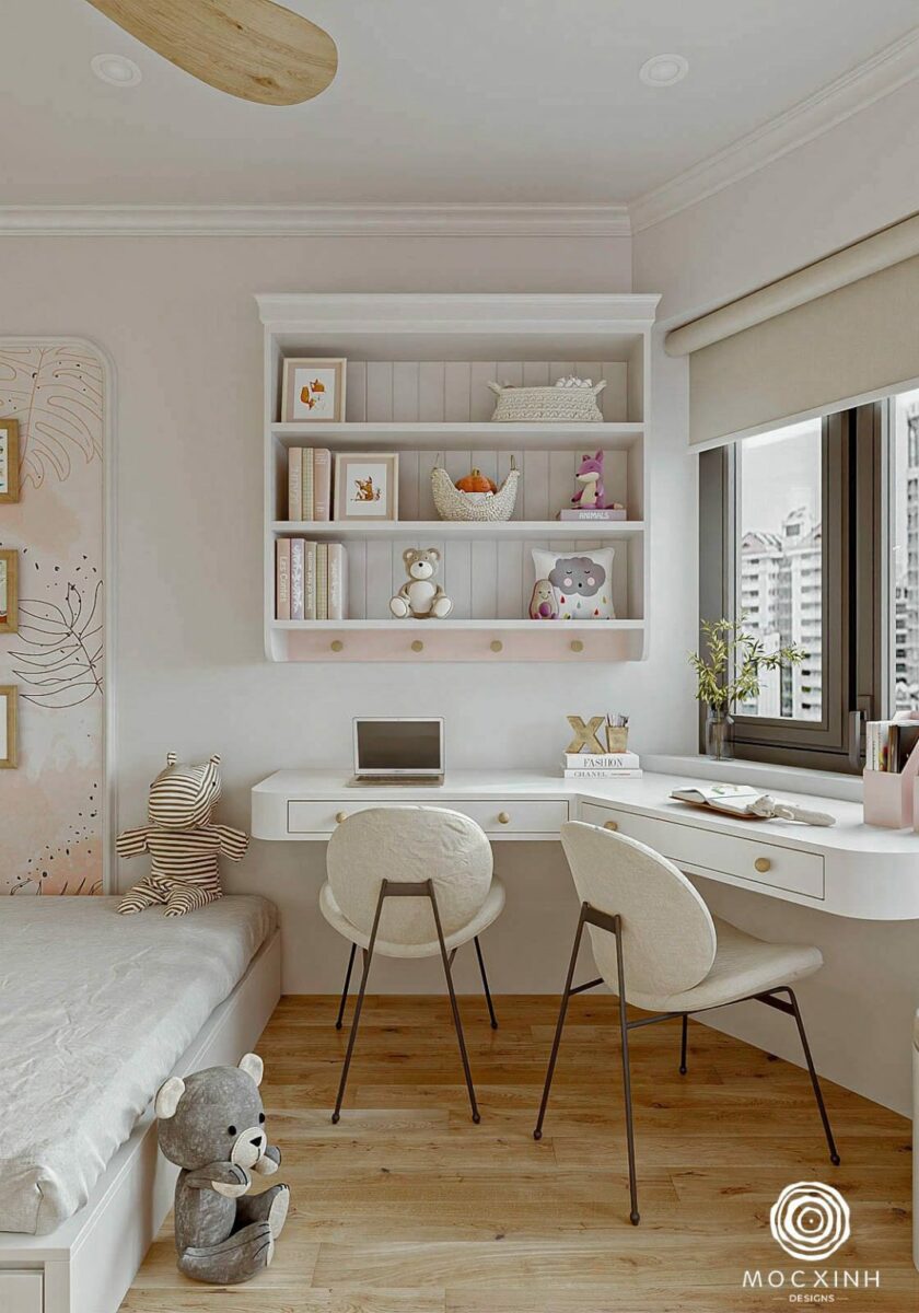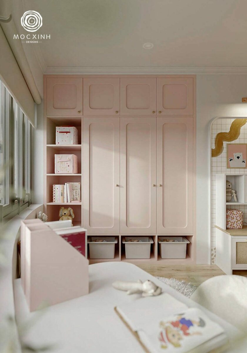 Trong phòng ngủ của bé, tone hồng pastel – màu sắc ưa thích của các công chúa nhỏ được vận dụng để tạo không gian xinh xắn cho bé được tự do sống trong căn phòng mơ ước. Các phần tủ quần áo, giường ngủ và kệ để đổ được sắp xếp hợp lý để tối ưu không gian mà vẫn đầy đủ công năng cho sinh hoạt hàng ngày.