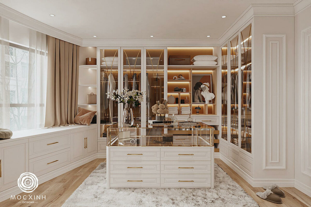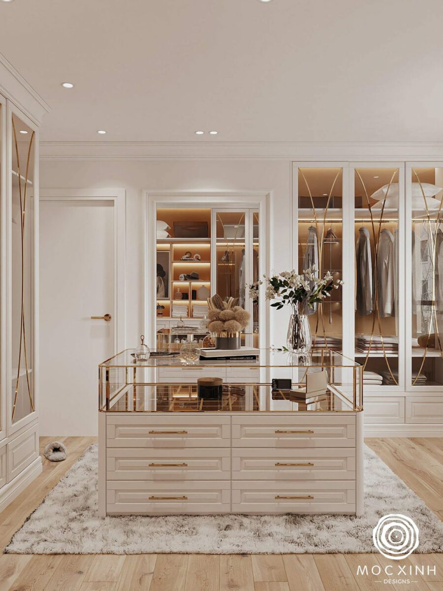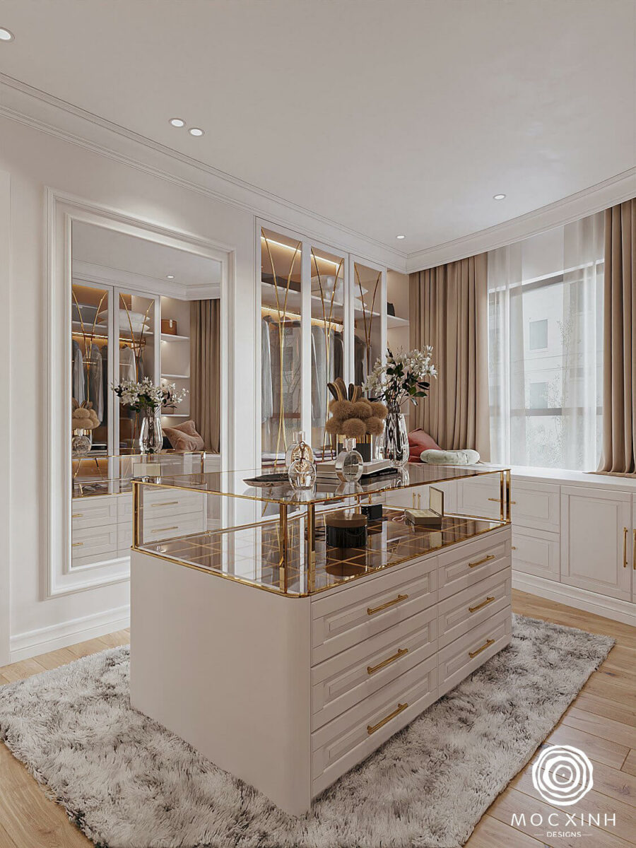 Điểm nhấn của căn hộ nằm ở phòng thay đồ. Với thiết kế sang trọng, đây là nơi khẳng định cá tính của gia chủ và là phần không gian đặc biệt không những để lưu trữ quần áo, phụ kiện và đồ trang sức mà còn tạo cảm hứng cho ngày mới năng lượng và tích cực.