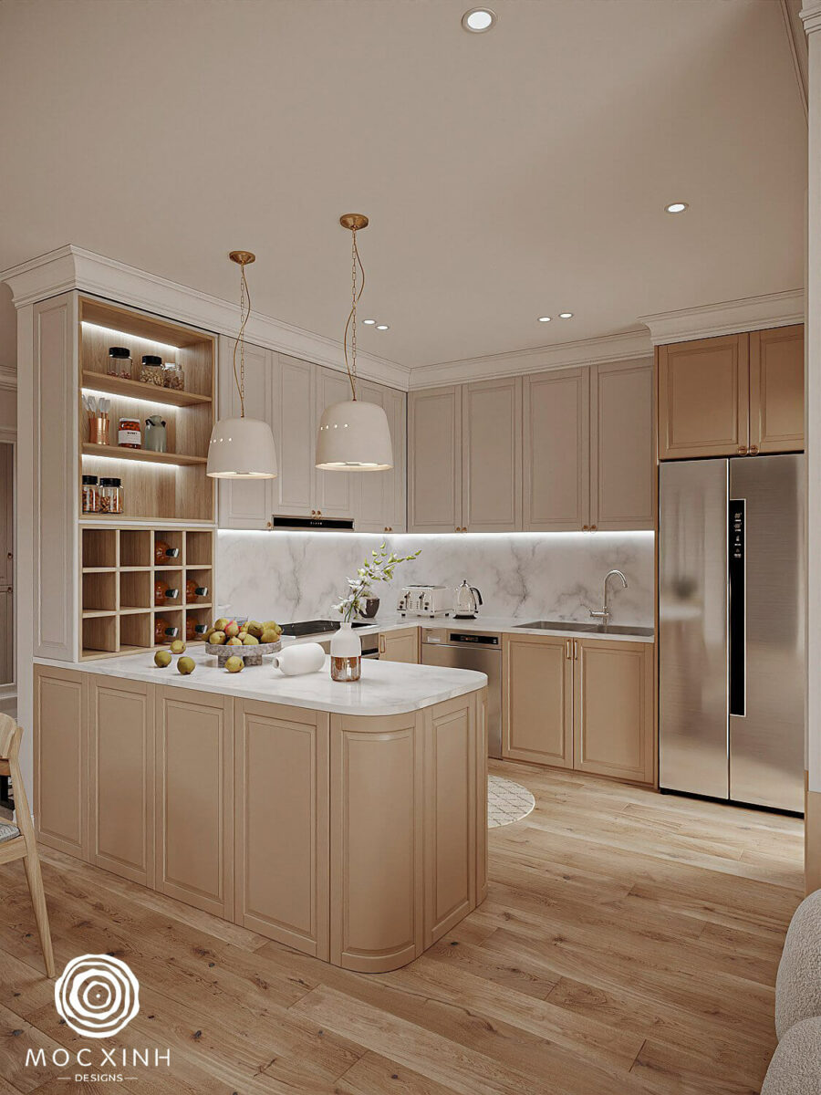 Trong không gian phòng bếp, kệ bếp được phủ lớp sơn trắng – be kết hợp cùng mặt vân đá hài hòa mang lại cảm giác tinh khôi và mới mẻ cho những bữa cơm gia đình đầm ấm.