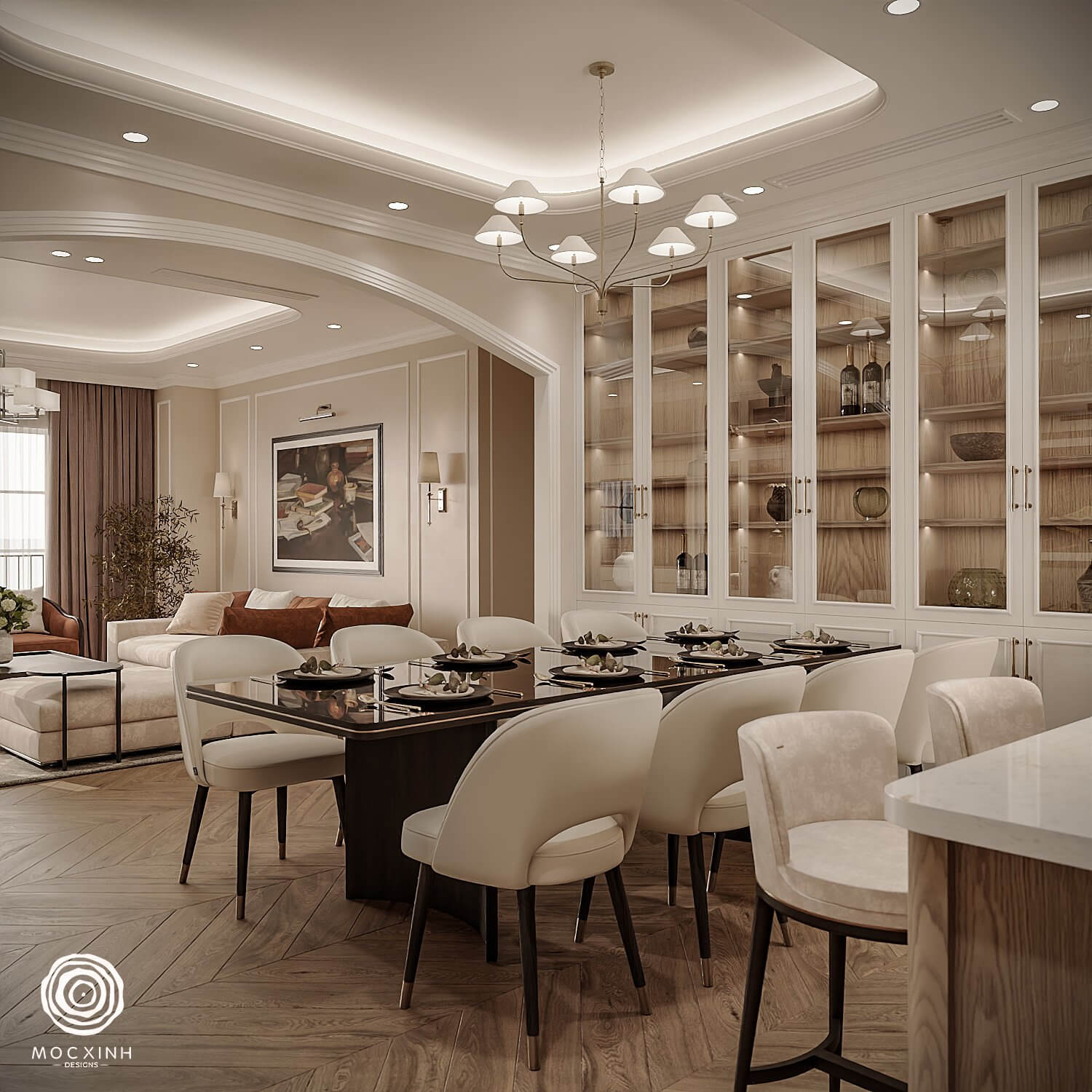 Bàn ăn được đặt tại trung tâm của căn hộ, nơi ánh sáng và đường cong cùng hiện diện để tạo nên một cảm giác thư thái, gần gũi. Thiết kế bàn ăn đơn giản với mặt kính tối màu và ghế bọc nỉ sáng mang lại sự cân bằng giữa nét hiện đại và cổ điển – tinh thần chủ đạo của phong cách Transitional.