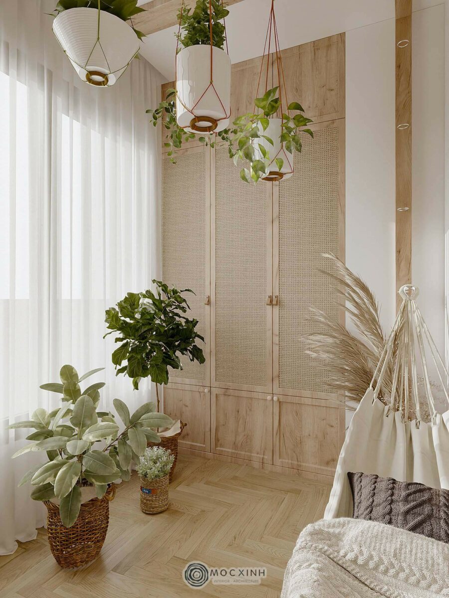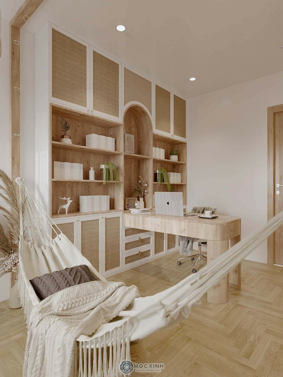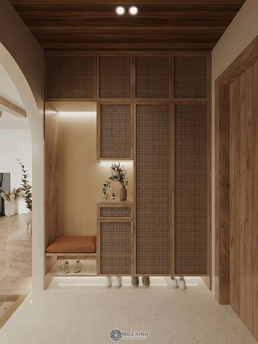 Tủ giày được thiết kế theo phong cách mộc mạc mang vẻ đẹp đơn giản, tự nhiên, tạo ra một không gian lưu trữ giày đẹp mắt và gần gũi. Bên trong tủ được thêm đèn Led để tăng thêm điểm nhấn và tạo sự sang trọng cho tủ giày. Với thiết kế này bạn có thể sử dụng các chất liệu nhẹ như gỗ công nghiệp (MDF, MFC hoặc Plywood). Phần cánh đan mây bạn có thể sử dụng mây nhựa nhân tạo hoặc mây tự nhiên. Để cho màu sắc như trong thiết kế, Mộc Xinh đề xuất dùng mây tự nhiên sẽ đem đến hiệu quả thẩm mỹ cao nhất. Việc bạn sử dụng dịch vụ thiết kế nội thất sẽ tạo nên một chiếc tủ giày mang tính cá nhân và phù hợp với hiện trạng căn nhà như thế này.