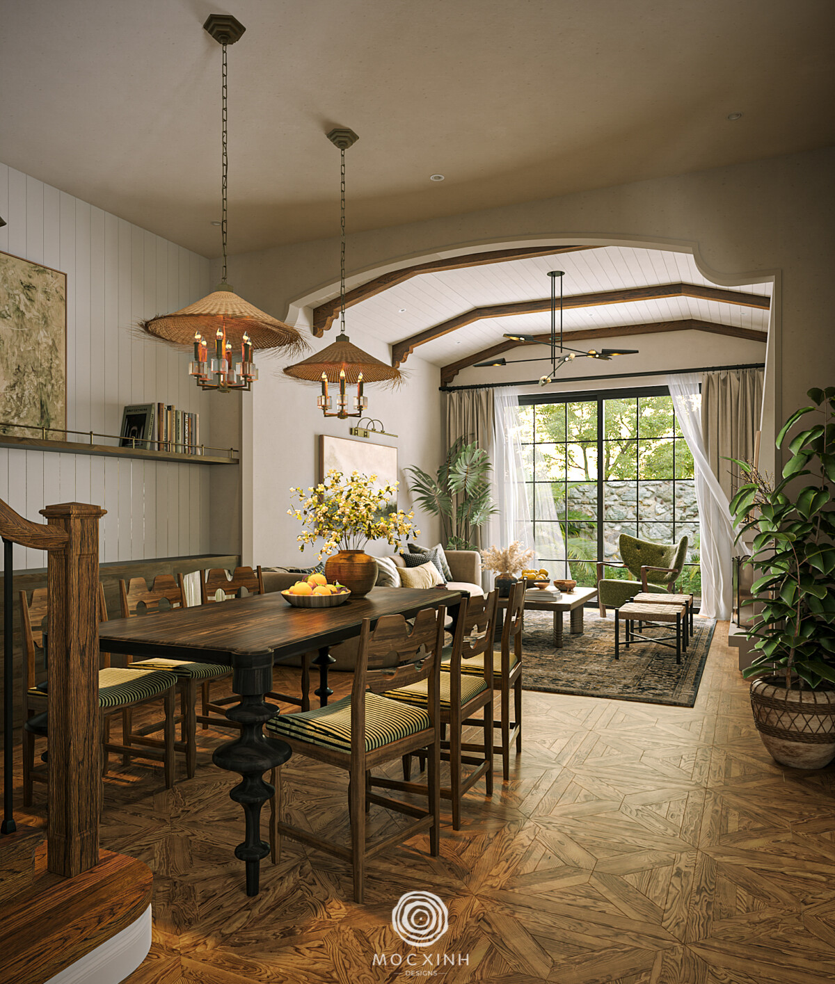 Trần ghép ván, cong vòm và lộ dầm đặc trưng của phong cách Modern Farmhouse nhưng được thêm thắt hình thức “bẩy đỡ” phía hai đầu dầm của nhà cổ truyền Việt Nam