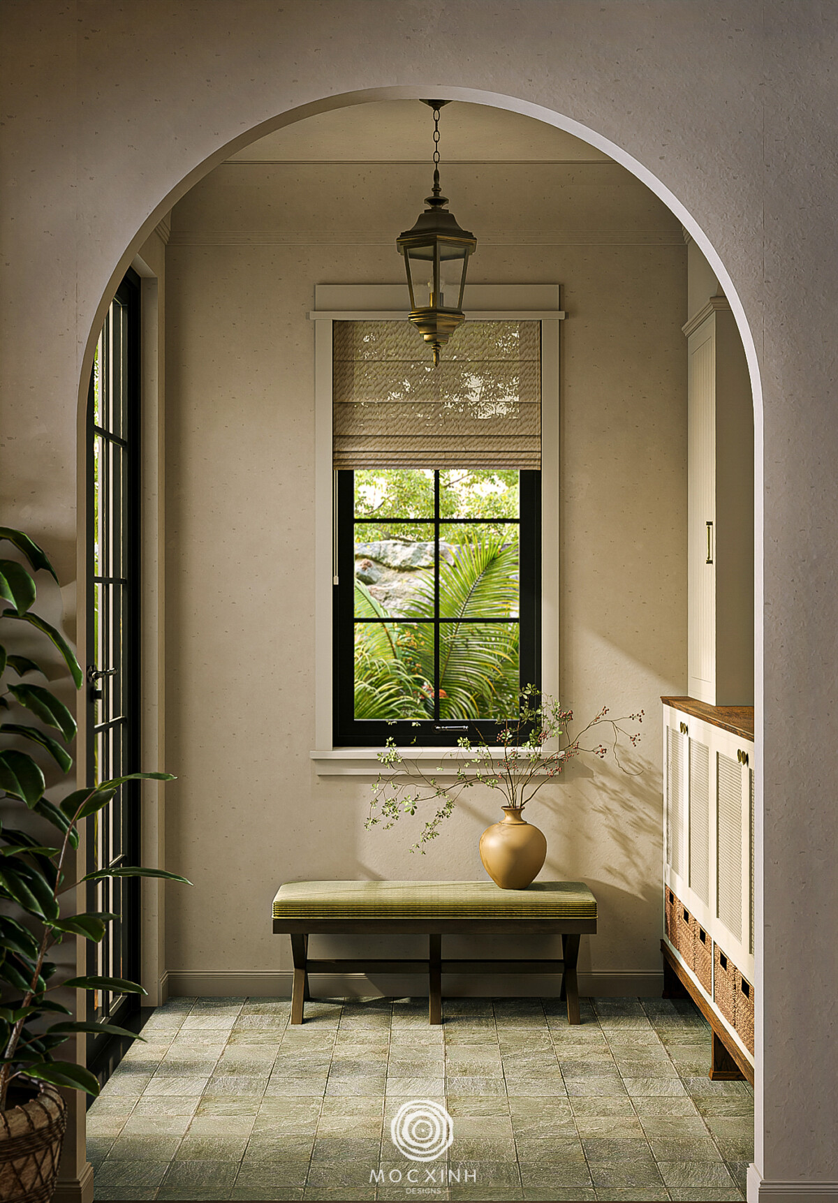 Với thiết kế của The Northern Homestead Haven, Mộc Xinh đem tới sự thay đổi tính chất của không gian ngay từ điểm bắt đầu là sảnh trước. Hiện trạng ban đầu của sảnh được thiết kế hiện đại và có tính ước lệ sẽ được thay thế bằng những chi tiết vòm có tính phân vị không gian mạnh và rõ ràng hơn.