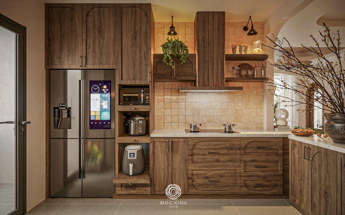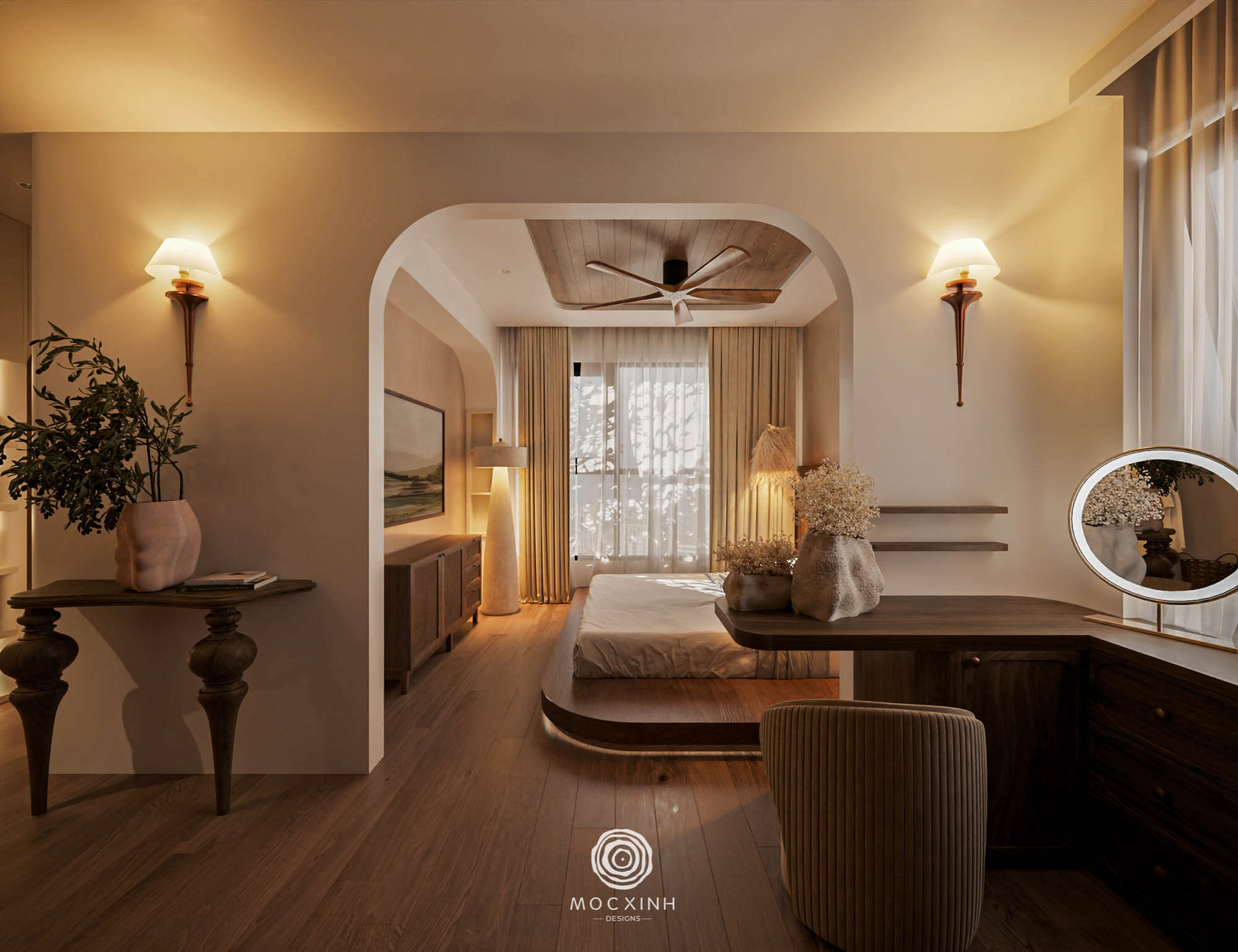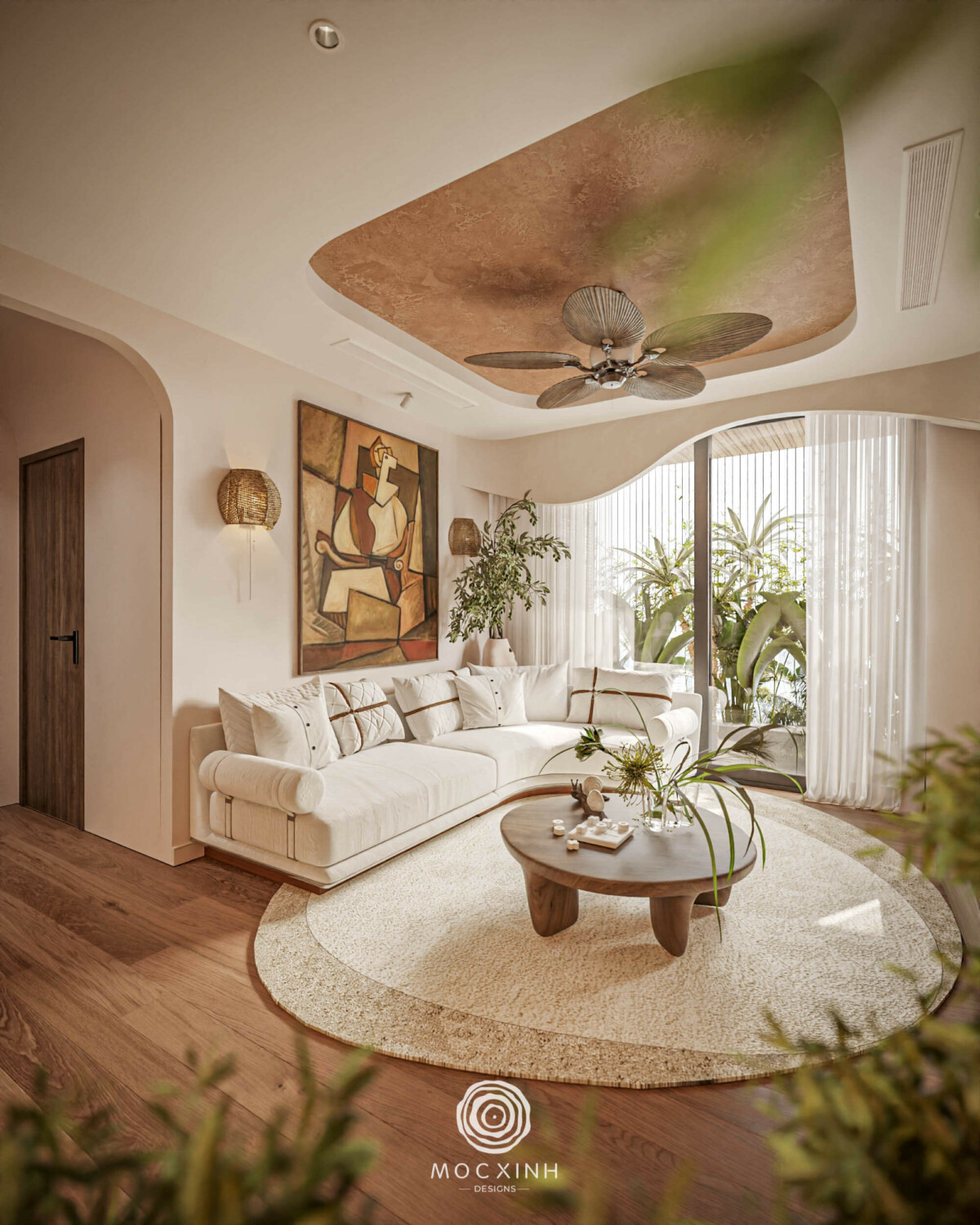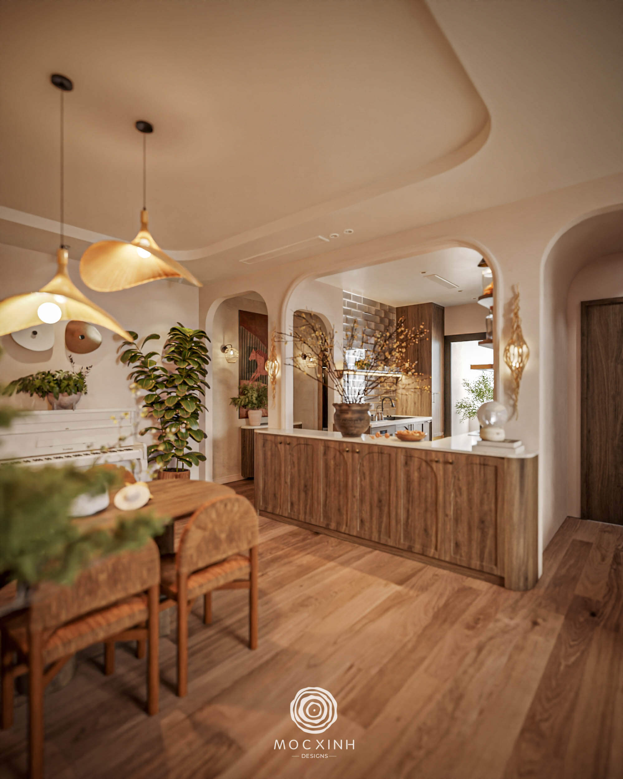 Vẻ đẹp không hoàn hảo của tinh thần Wabi-sabi kết hợp với Japandi là điểm nhấn đặc trưng nhất để Mộc Xinh mang cảm giác tự nhiên, tĩnh tại và bền vững với thời gian vào trong dự án này. Không gian sinh hoạt được nối liền bởi những đường nét mềm mại, hình khối bo cong với vật liệu mộc như gỗ, đá, gạch thô nhằm tạo nên cảm giác gần gũi và an yên cho người ở.