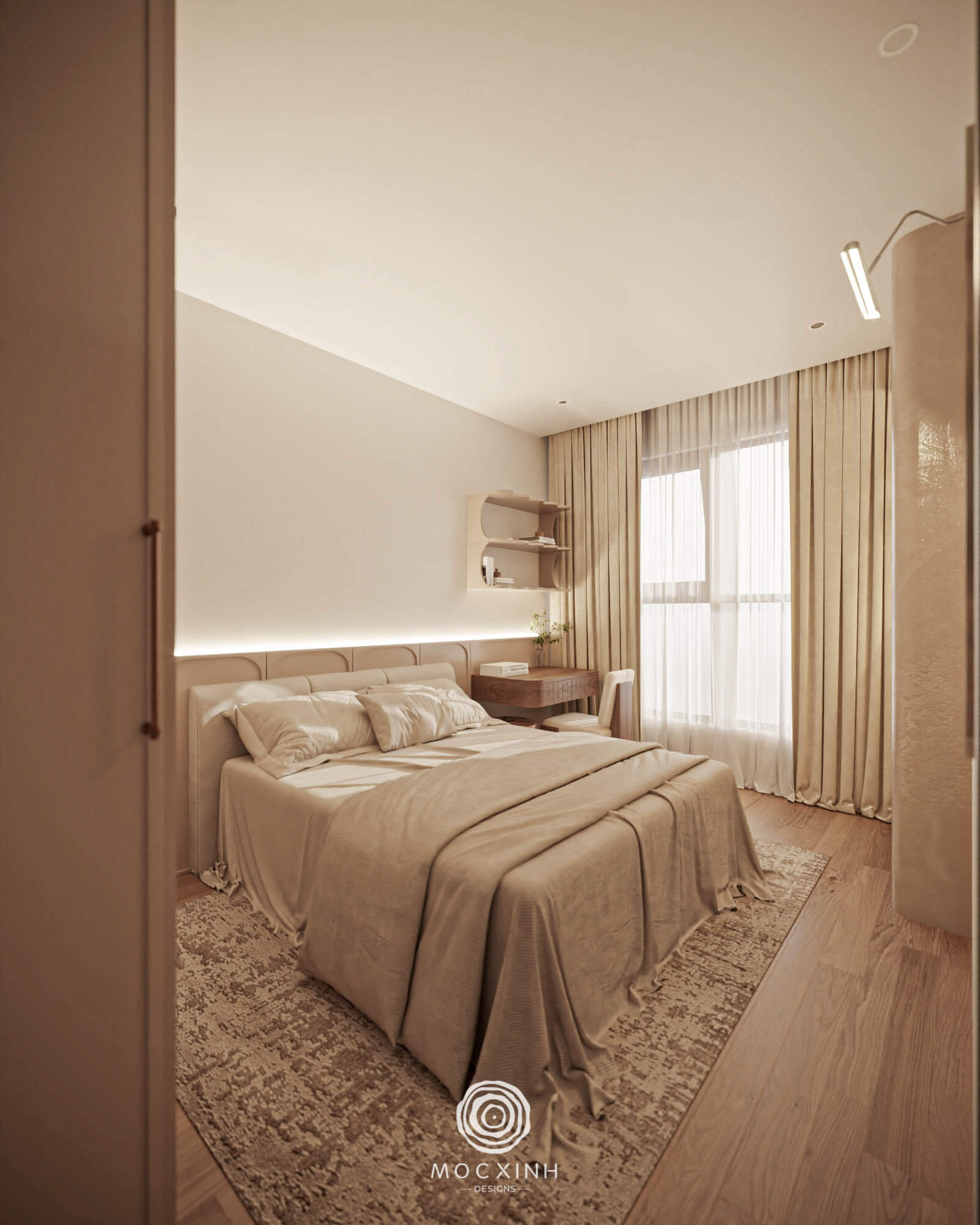 Gia chủ là người yêu ánh sáng tự nhiên, vì vậy thiết kế tập trung tận dụng tối đa các ô cửa và ban công để ánh sáng có thể lan tỏa sâu vào không gian sinh hoạt chung. Ánh sáng không chỉ đóng vai trò điều hoà cho không gian mà còn trở thành yếu tố thẩm mỹ làm nổi bật chất liệu gỗ ấm, mảng tường màu trung tính và những chi tiết trang trí mang hơi hướng Á Đông tối giản. Màu sắc chủ đạo là gam màu ấm từ cấp độ sáng đến trầm, càng làm nổi bật và cộng hưởng với ánh sáng tự nhiên trong không gian.