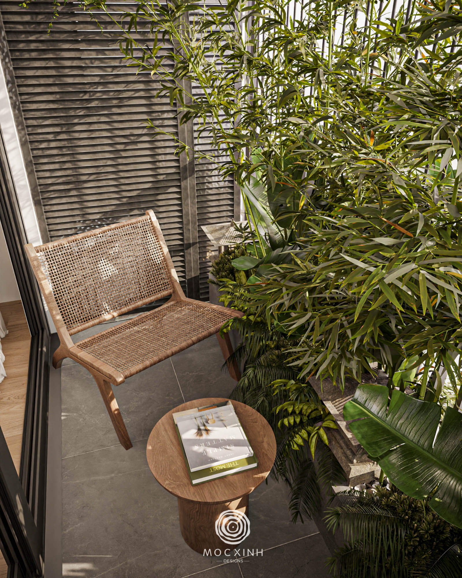 Sự kết hợp hài hòa giữa ánh sáng, vật liệu tự nhiên và cây xanh tạo nên một tổng thể Japandi nhẹ nhàng, trong đó tinh thần Wabi-sabi được thể hiện rõ qua sự giản dị, mộc mạc nhưng giàu chiều sâu cảm xúc.