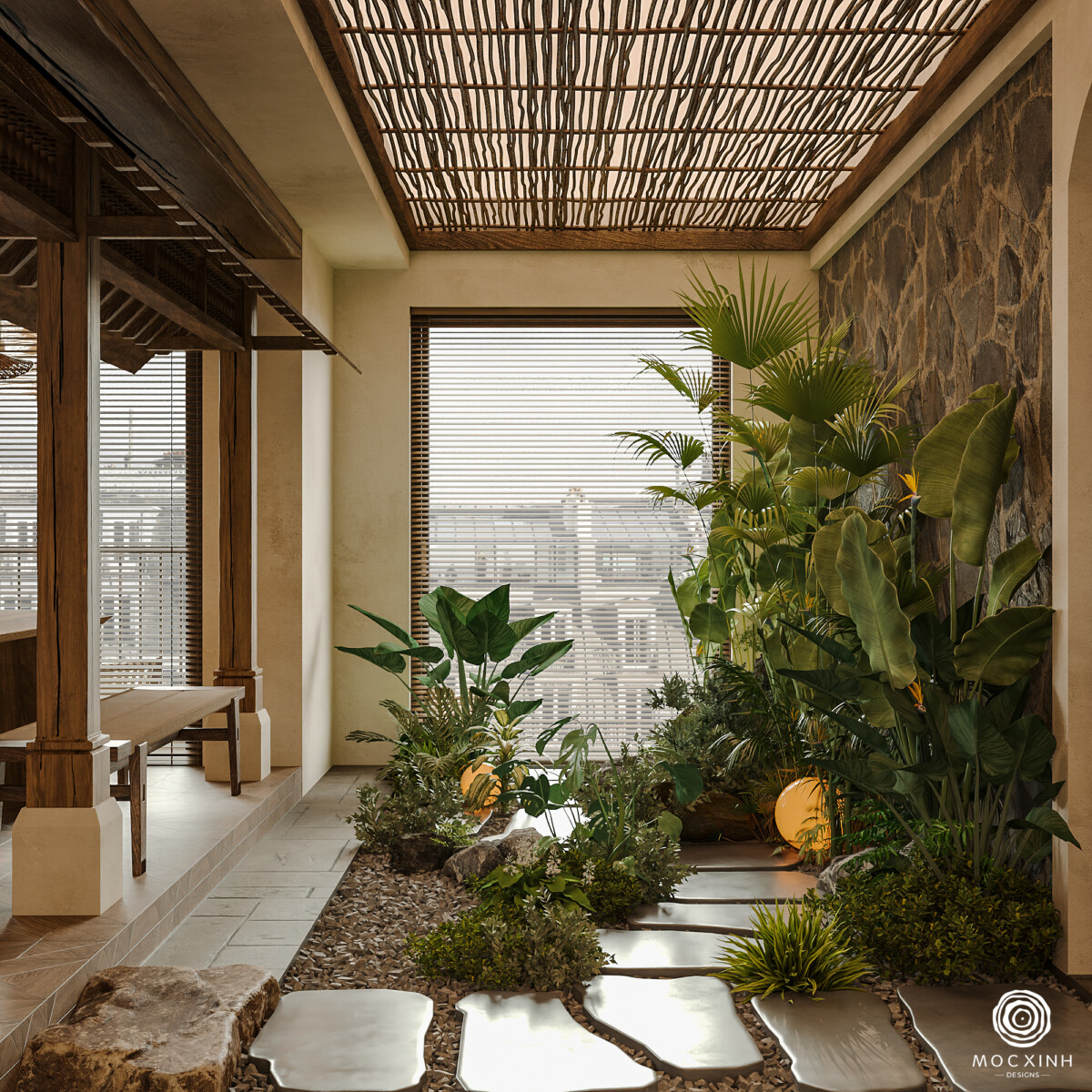 Mộc Xinh đã đề xuất phương án tái cấu trúc mặt bằng: bỏ đi một phòng ngủ phụ, nâng sàn, dành phần diện tích ấy cho một khu vườn xanh trong nhà, đây sẽ được coi như “trái tim” của toàn bộ căn hộ. Không gian này vừa tạo nên điểm nhấn cảm xúc, vừa chia tách tinh tế giữa khu sinh hoạt chung và khu nghỉ ngơi, mang lại một trải nghiệm sống mềm mại và tự nhiên hơn.