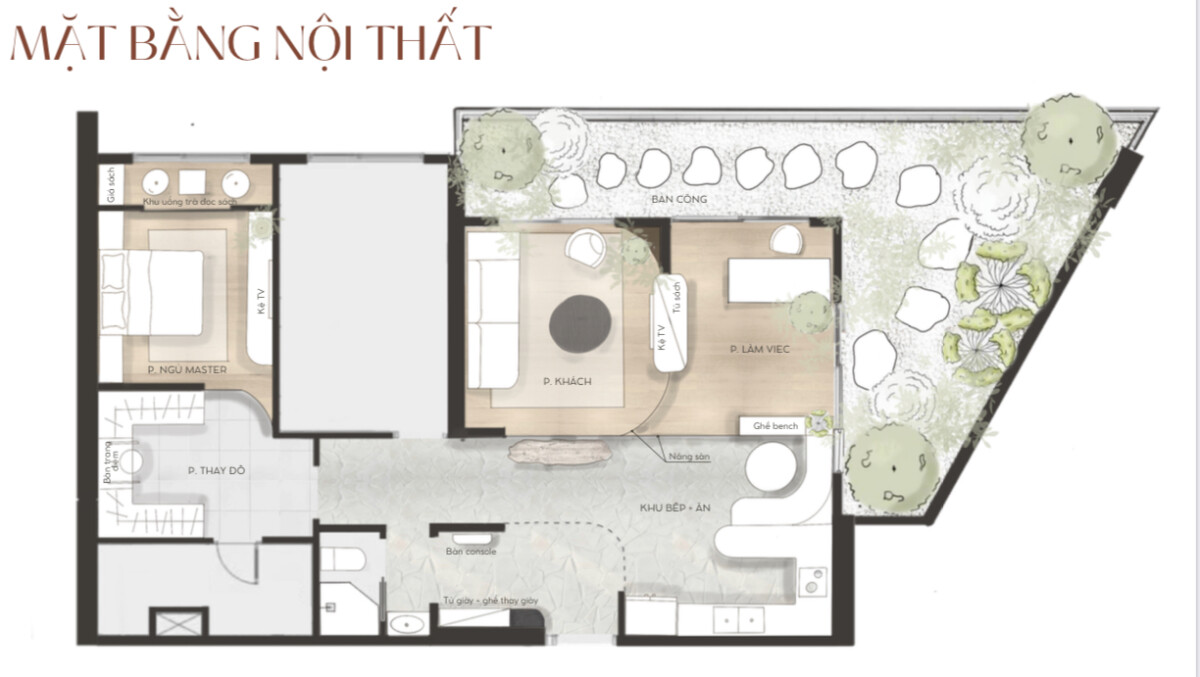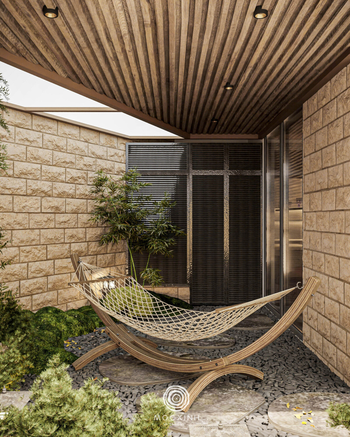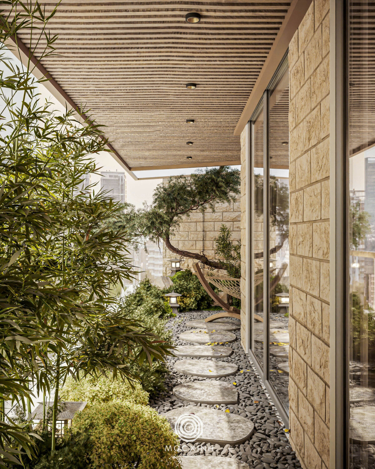 Sự thay đổi này giúp trục sinh hoạt chính trở về trung tâm của căn hộ và khai thác được toàn bộ chiều dài của khu vườn. Ánh sáng, cây xanh và không khí ngoài trời sẽ trở thành bối cảnh tự nhiên cho đời sống hàng ngày. Không gian sinh hoạt trung tâm có thể trở thành nơi tiếp khách, làm việc, uống trà, đọc sách hoặc đơn giản là nơi các thành viên ngồi cạnh khu vườn và trò chuyện cùng nhau.
