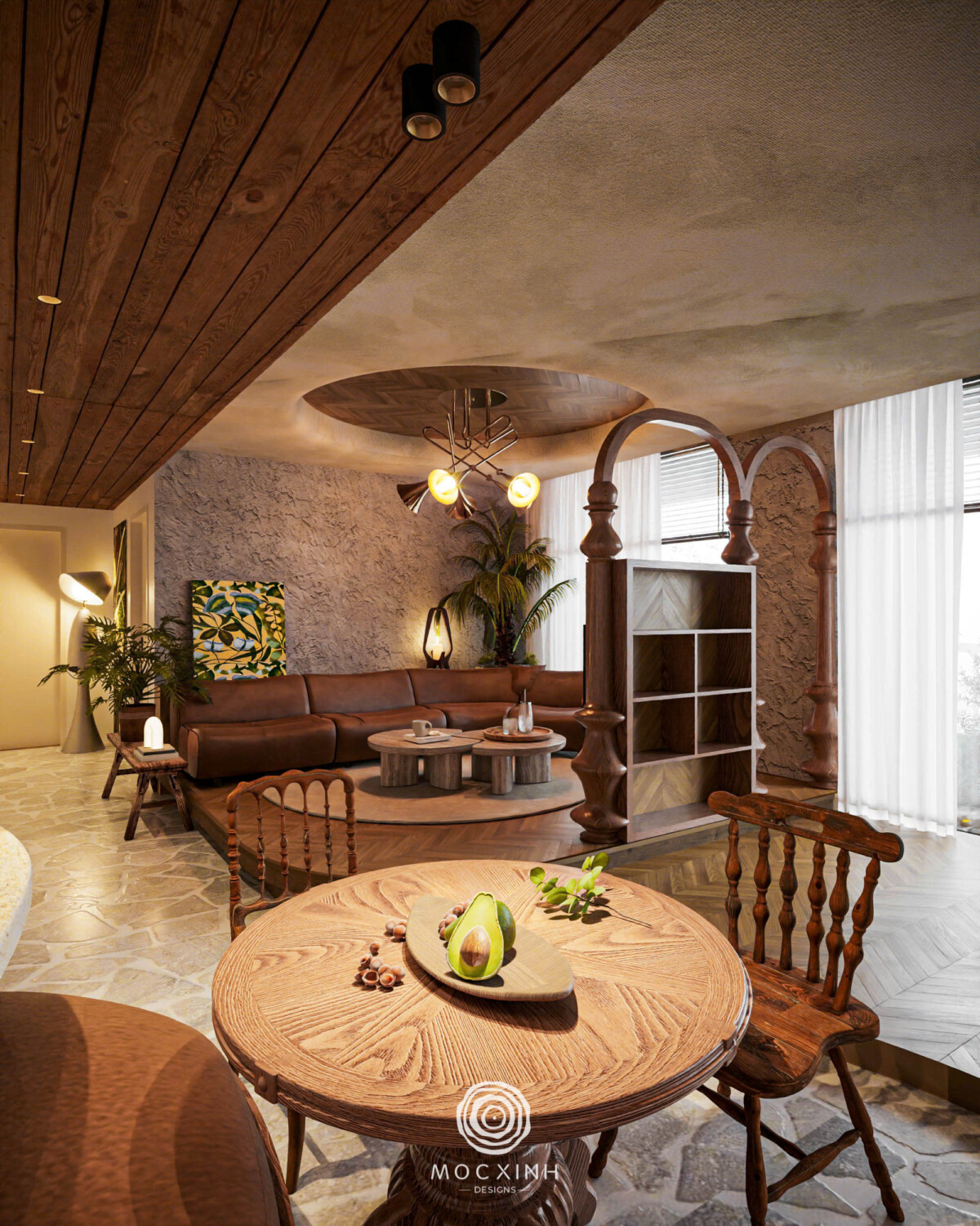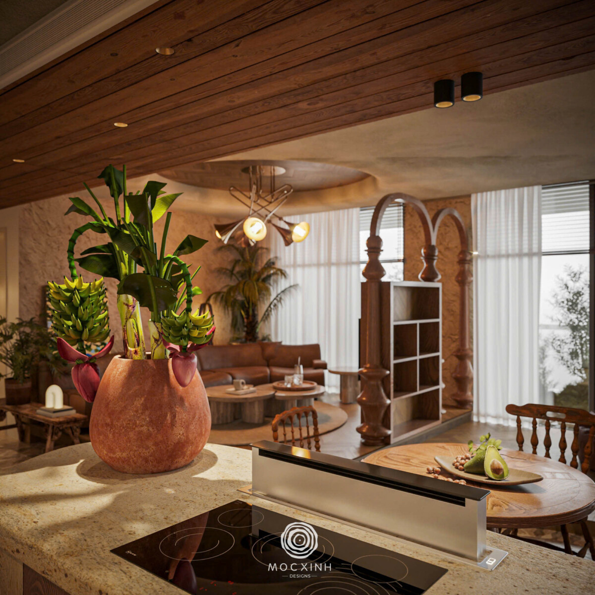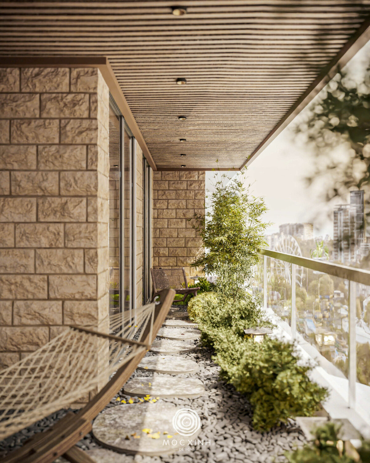 Về mặt không gian, yếu tố này tạo nên một căn hộ vừa gần gũi thiên nhiên vừa phản ánh cá tính sáng tạo của người sống trong đó. Bối cảnh sống của gia chủ, nhờ đó, sẽ có đầy đủ cả khoảng lặng và động lực cho những sáng tạo, khao khát tự do và tính cách cá nhân.