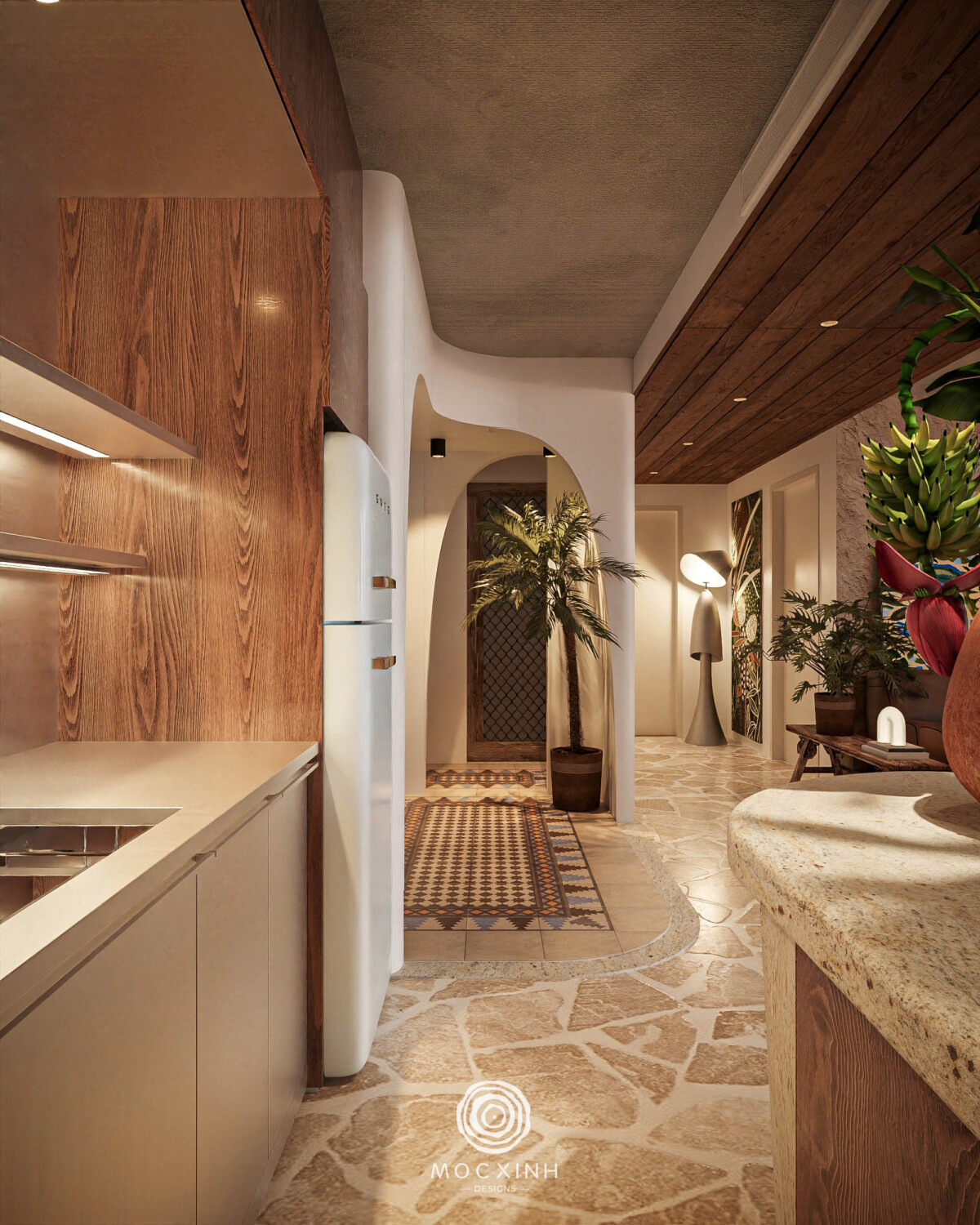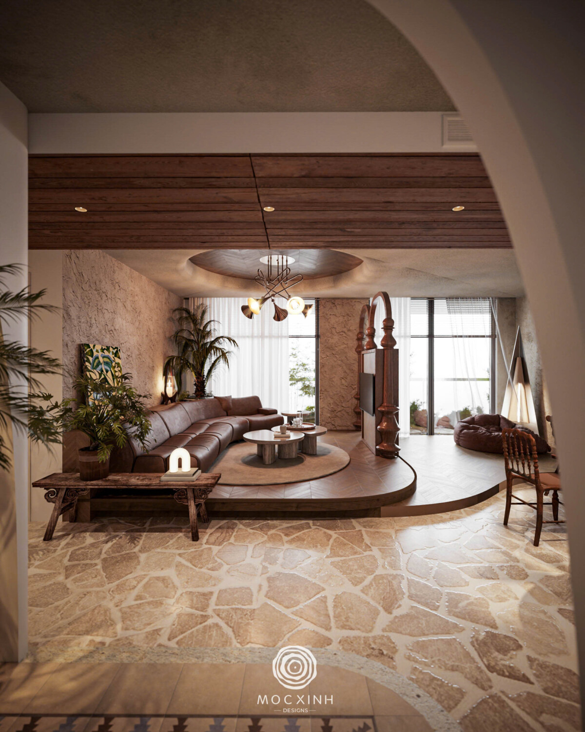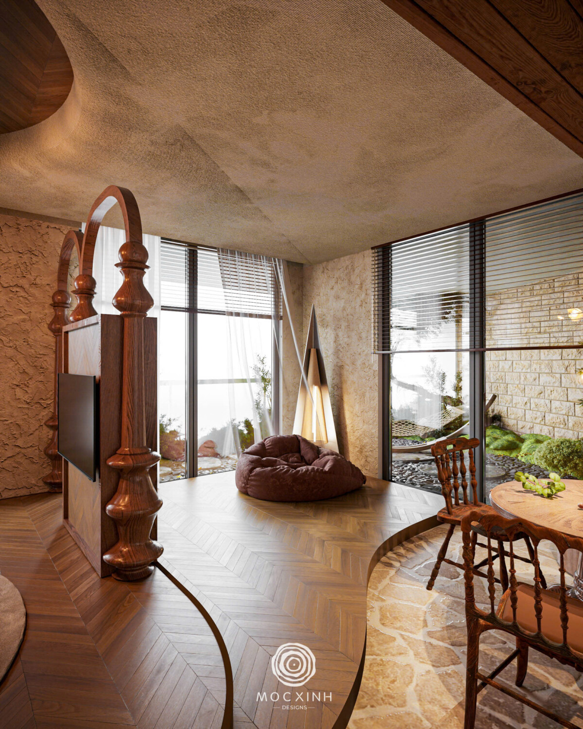 Về mặt không gian, yếu tố này tạo nên một căn hộ vừa gần gũi thiên nhiên vừa phản ánh cá tính sáng tạo của người sống trong đó. Bối cảnh sống của gia chủ, nhờ đó, sẽ có đầy đủ cả khoảng lặng và động lực cho những sáng tạo, khao khát tự do và tính cách cá nhân.