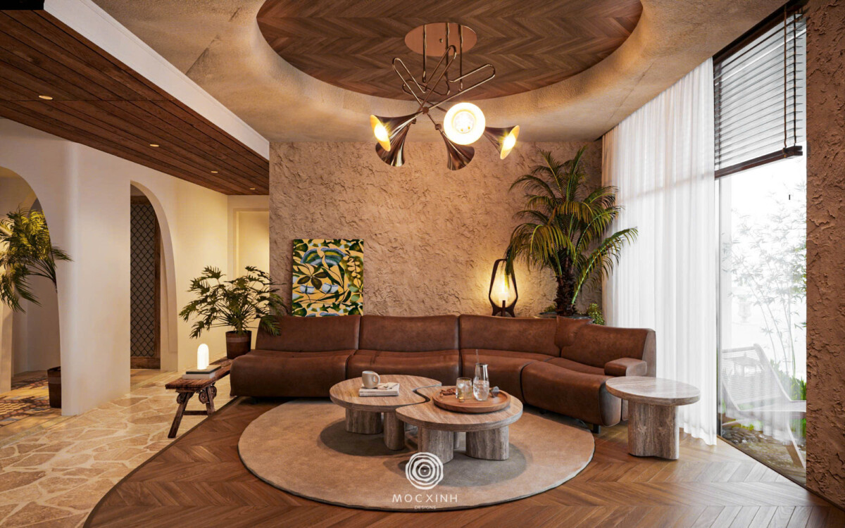 Với gia chủ của căn hộ 3 phòng ngủ Sky Forest, chúng tôi chọn sự giao thoa giữa Wabi-sabi và Tropical làm phong cách thiết kế. Trong khi Wabi-sabi mang tới cảm giác tĩnh lặng và tự nhiên thông qua các bề mặt vật liệu thô mộc, ánh sáng mềm và bảng màu trung tính. Thì Tropical đem tới sự phong phú, sức sống qua cây xanh, ánh sáng, nội thất đồ rời độc bản kiểu dáng mới lạ và các mảng miếng màu sắc mạnh mẽ.