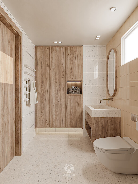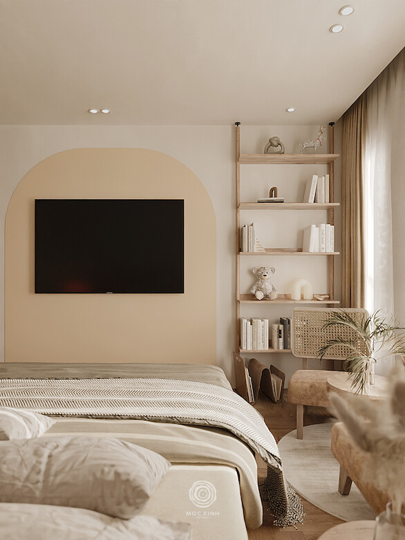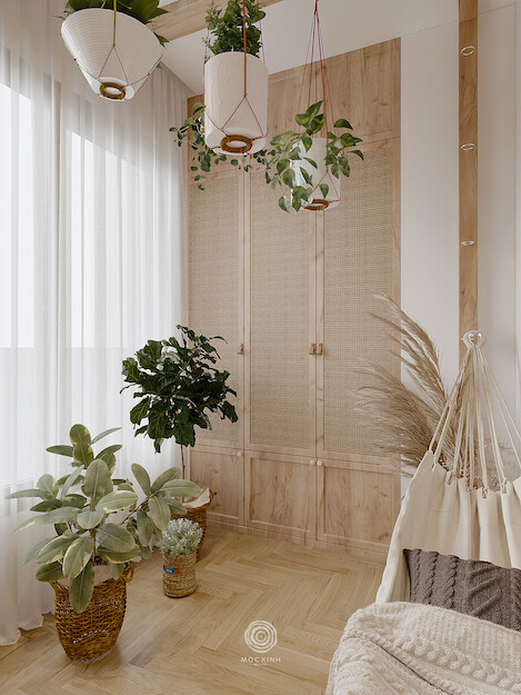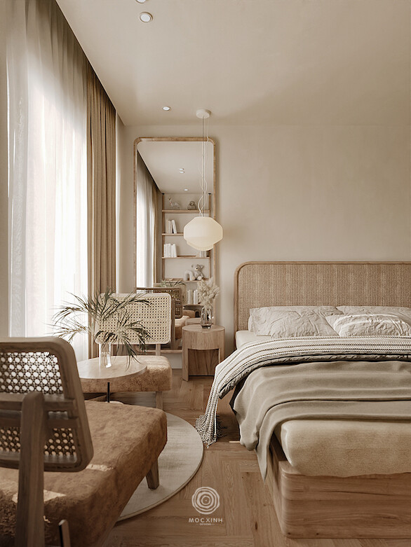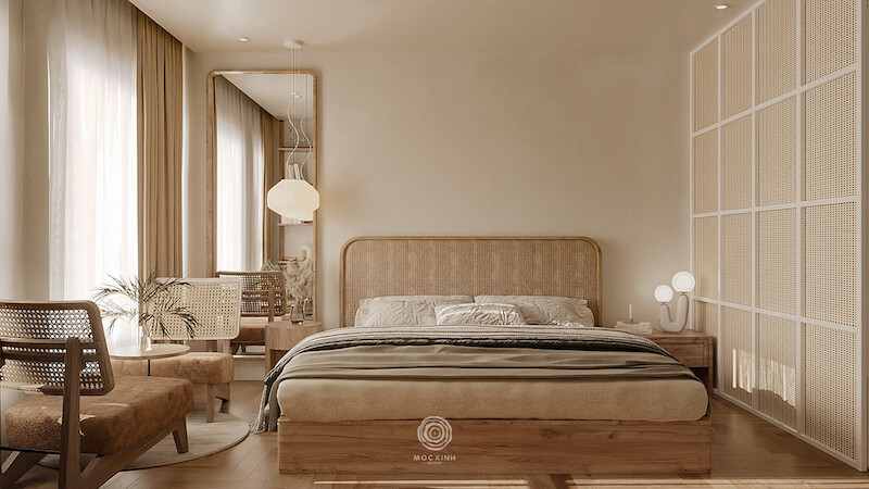 Thay thế cho những mảng gỗ sẫm màu cũ kỹ là hệ gỗ sáng màu kết hợp cùng vật liệu mây đan mắt cáo. Sự xuất hiện của mây tre không chỉ gợi nhắc về nét văn hóa Việt mà còn tạo ra những hiệu ứng xuyên thấu, giúp nội thất trông nhẹ nhàng và bay bổng hơn. Từ hệ tủ kịch trần đến đầu giường, mọi chi tiết đều được bo cong mềm mại, xóa tan sự cứng nhắc của những bức tường bê tông.
