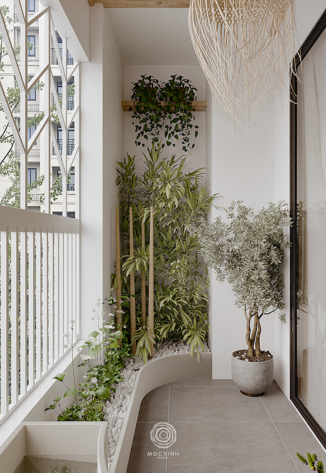 Gia chủ là người dành tình yêu đặc biệt cho cây xanh, vì thế Mộc Xinh đã khéo léo biến mỗi góc nhỏ thành một “vườn treo” thu nhỏ. Những chậu cây lớn nhỏ được bài trí một cách khéo léo không chỉ tăng tính thẩm mỹ mà còn đóng vai trò như một bộ lọc không khí tự nhiên, mang lại cảm giác thông thoáng và dễ chịu.