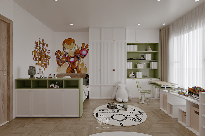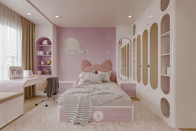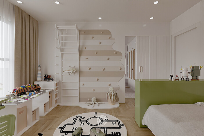 Hệ thống phòng ngủ của bé là sự kết hợp đầy ngộ nghĩnh và rực rỡ của vật liệu tự nhiên với những màu sắc và hình vẽ bắt mắt, để bé thoả thích đắm mình vào không gian vui nhộn của thế giới tuổi thơ. Mọi chi tiết, từ chiếc giường nhỏ xinh đến mảng tường nghệ thuật, đều được thiết kế gọn nhẹ, gần gũi và tối ưu công năng, nhằm tạo ra một không gian an toàn, tràn ngập năng lượng và cảm hứng sáng tạo cho các cư dân nhí.