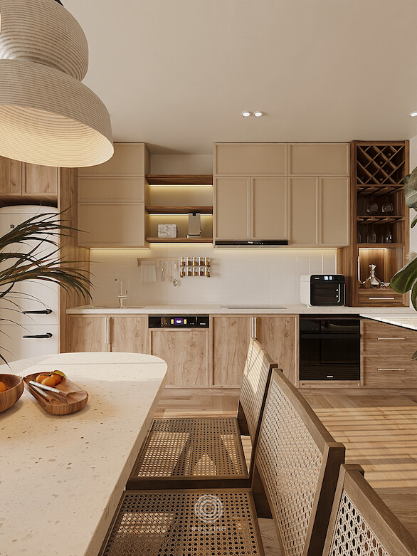 Đội ngũ đã kết hợp màu sắc độc đáo với những gam màu của gỗ tự nhiên, tạo nên sự ấn tượng về thẩm mỹ. Bảng màu trung tính với trắng kem, be và nâu gỗ làm chủ đạo, giúp tối ưu hóa ánh sáng tự nhiên từ các khung cửa sổ lớn. Ánh sáng không còn bị ngăn trở mà len lỏi khắp các ngóc ngách, làm bừng tỉnh sức sống cho căn hộ.