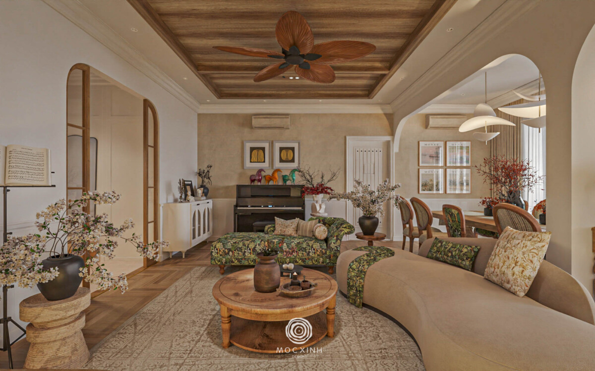 Điều khiến chị ấn tượng ngay từ đầu là phong cách Modern Farmhouse ấm áp, mộc mạc và gần gũi. Không phô trương hay cầu kỳ, không gian nghỉ dưỡng trong tâm tưởng của chị phải là nơi mang đến cảm giác thân thiện và dễ chịu. Qua nhiều lần trao đổi, Mộc Xinh dần thấu hiểu nhịp sống và mong muốn của gia chủ, từ đó kết tinh thành một tinh thần thiết kế chung cho căn hộ