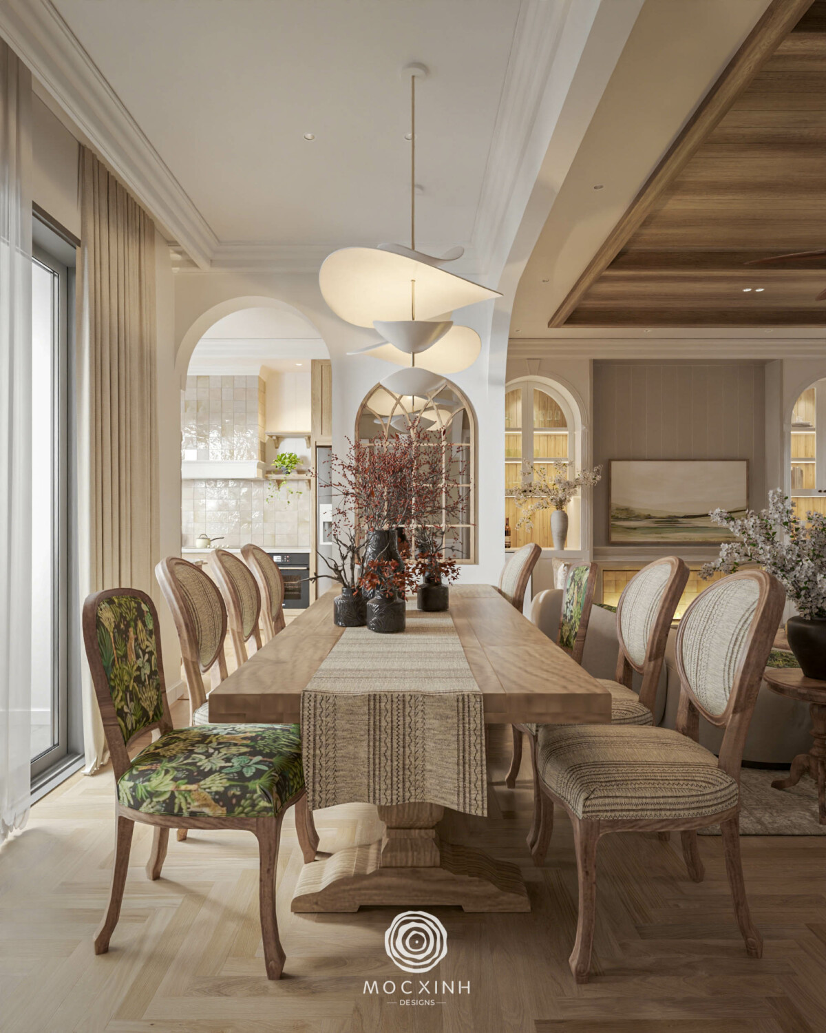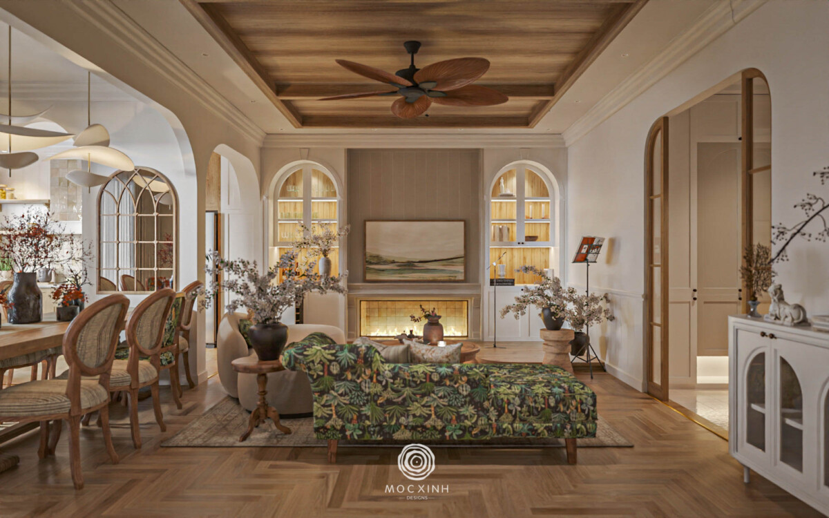 Điểm nhấn đặc trưng nằm ở hệ vòm cong liên kết các khu vực chức năng tạo nên sự chuyển tiếp êm ái, gợi cảm giác hoài niệm. Tất cả cùng hòa quyện để tạo nên một không gian Farmhouse hiện đại, để gia chủ có thể cảm nhận trọn vẹn tinh thần nghỉ dưỡng và nhịp sống từ tốn.