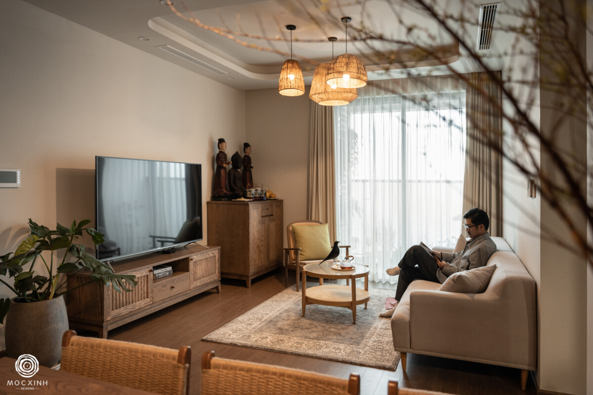 Với bài toán tạo dựng nên căn nhà hài hòa với môi trường làng quê và kết nối đa thế hệ, Mộc Xinh đã lựa chọn phong cách nhà vườn truyền thống Việt Nam kết hợp mô hình tam hợp viện từ Trung Quốc. Nội thất được giản lược và hiện đại hóa để tạo sự tiện nghi, thoáng rộng trong sinh hoạt hàng ngày. Chất liệu thô mộc, thiết kế vuông vức, hài hòa giữa gạch – gỗ ấm cúng là cửa kính lớn view rộng, sofa êm ái, hệ đèn thông thái tạo xúc cảm dịu dàng cho không gian sống.