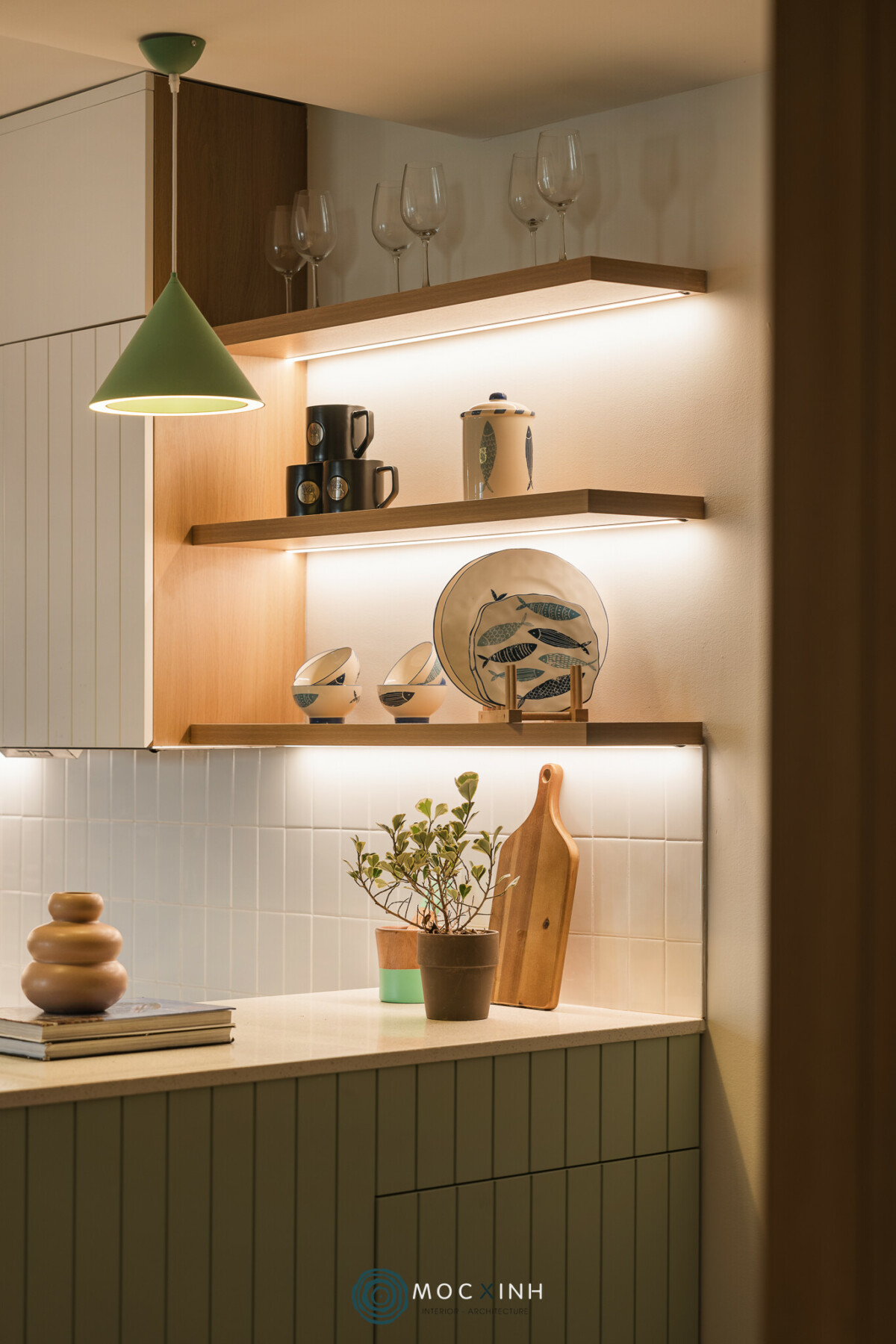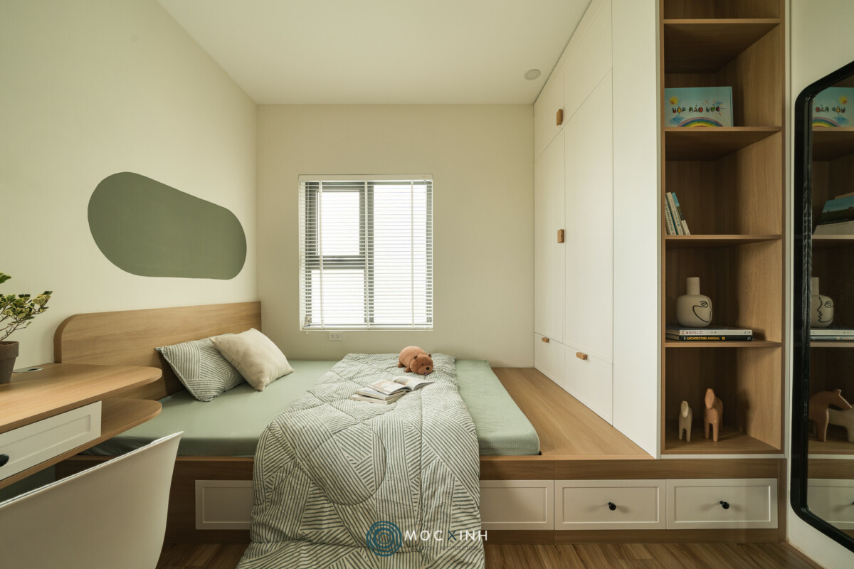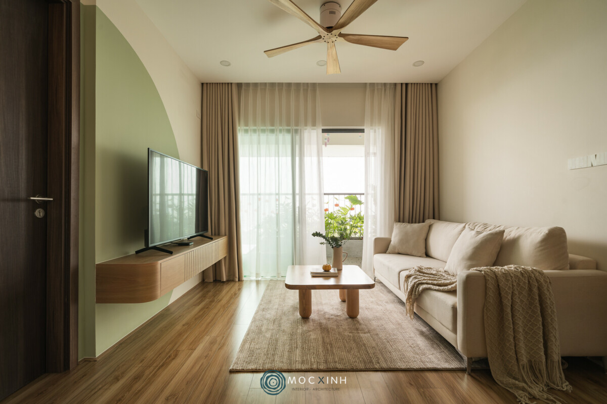 Tông xanh lá Pastel chủ đạo không chỉ mở ra một không gian mát mẻ, rộng rãi mà còn dẫn dắt hơi thở thiên nhiên vào căn hộ chung cư. Triết lý thiết kế của Mộc Xinh ở dự án này là sự tối giản trong đường nét nhưng tối đa trong cảm xúc. Sự thư thái không đến từ sự lộng lẫy, mà đến từ cách các mảng màu tương tác nhịp nhàng với ánh sáng tự nhiên.