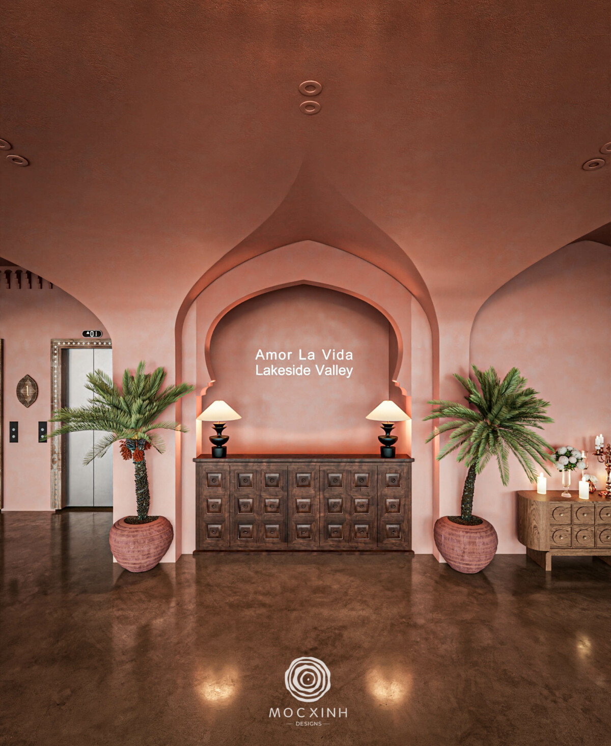 Gam màu sử dụng chính cho không gian là xám – đen – trắng – nâu thiên hướng trung tính trầm, do đó việc phân bố và tận dụng ánh sáng tự nhiên trong không gian cũng là bài toán mà đội ngũ thiết kế của Mộc Xinh phải tính toán chi tiết để làm cho không gian bớt đi cảm giác ngột ngạt và bức bối về mặt thị giác. Đội ngũ sử dụng những khung cửa sổ lớn và trải dài, kết hợp với các bóng đèn chiếu sáng khổ to và những khoảng xanh điểm xuyết nhằm tạo phương án điều hoà phù hợp.
