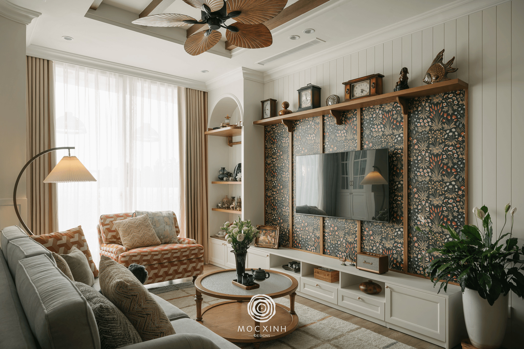 Với mong muốn mang đến một không gian sống tinh tế và hài hòa, Mộc Xinh lựa chọn bảng màu trung tính gồm các tông màu gỗ ấm áp và sắc be thanh lịch. Sự kết hợp này tạo nên một nền tảng hoàn hảo để tôn lên vẻ đẹp tự nhiên của các vật liệu và đồ nội thất. Điểm nhấn nổi bật trong không gian này là hệ thống ánh sáng điểm, sẽ như những điểm nhấn nghệ thuật tạo nên chiều sâu và sự sống động cho không gian.