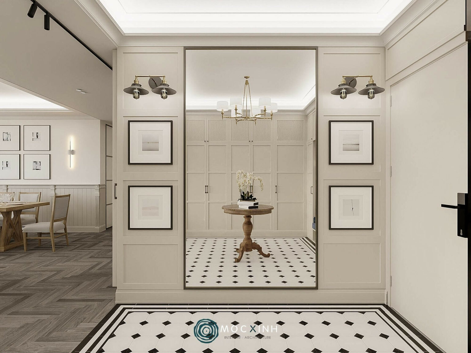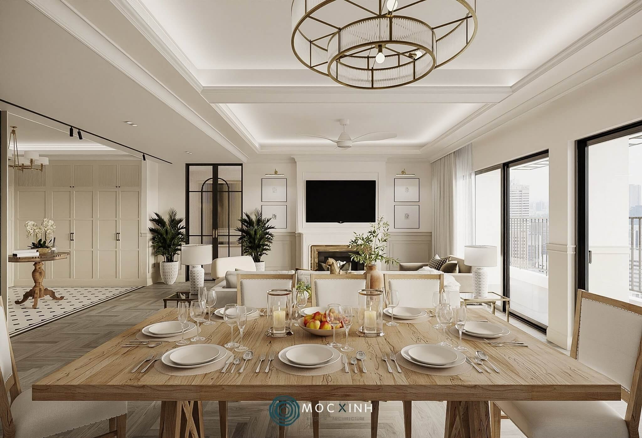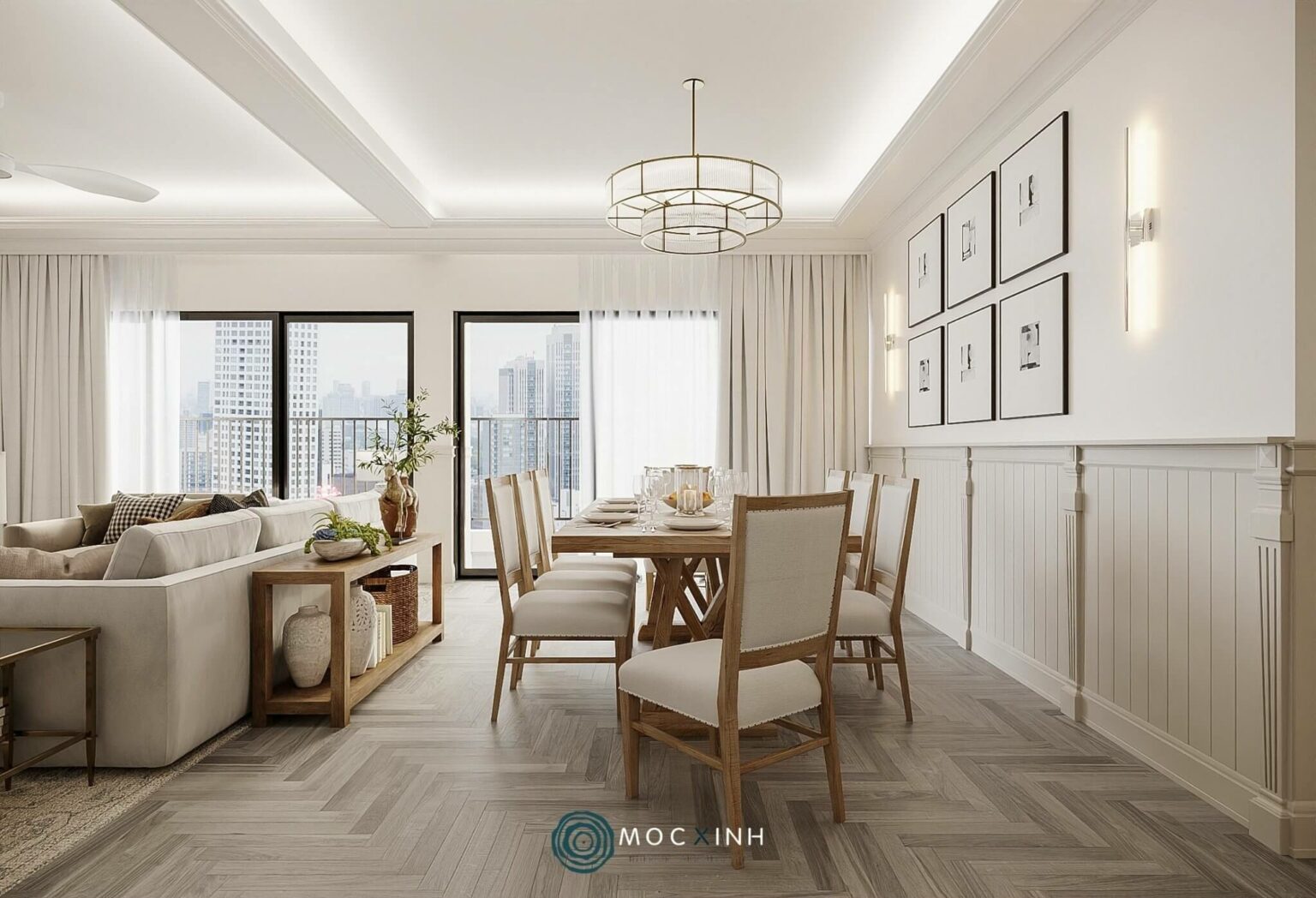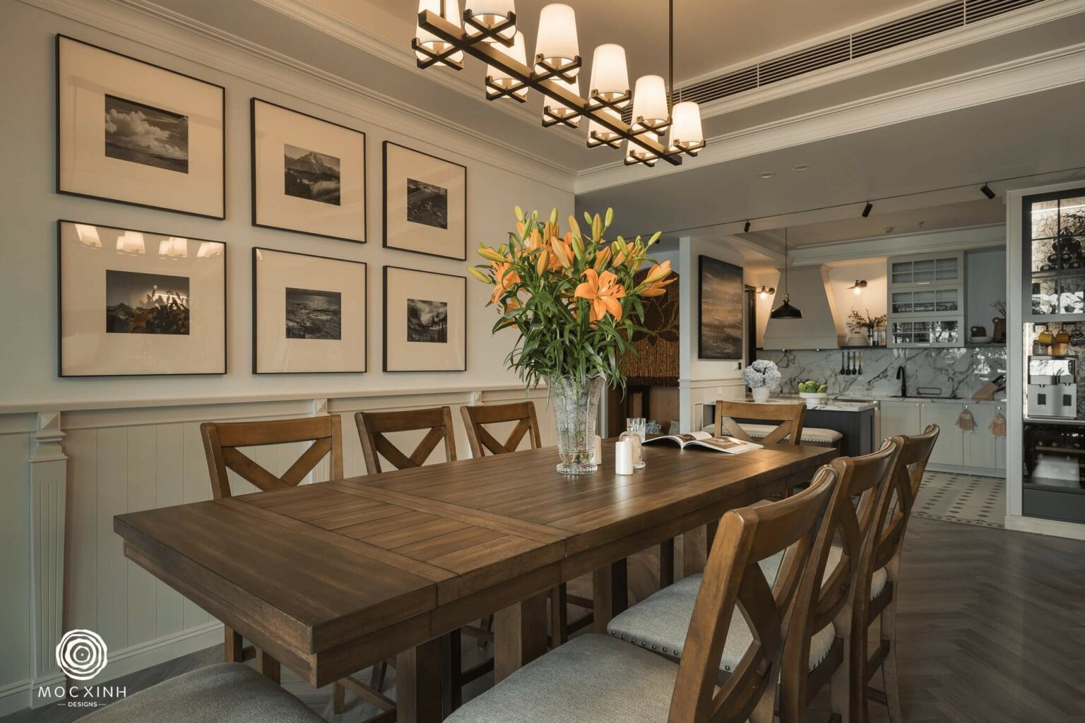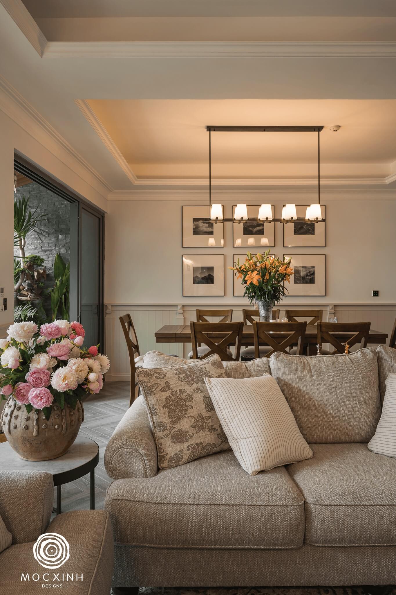 Thoát khỏi những xô bồ phố thị để về với miền bình yên, Mộc Xinh đã thực hiện nhiều sắp đặt ý tứ kết hợp hai phong cách Bắc Mỹ Traditional và Farmhouse. Sự giao thoa của vẻ đẹp đồng quê cổ điển với chiều sâu thời gian trong từng màu sắc, chất liệu đã tạo thành tổng thế tinh tế cho căn hộ.