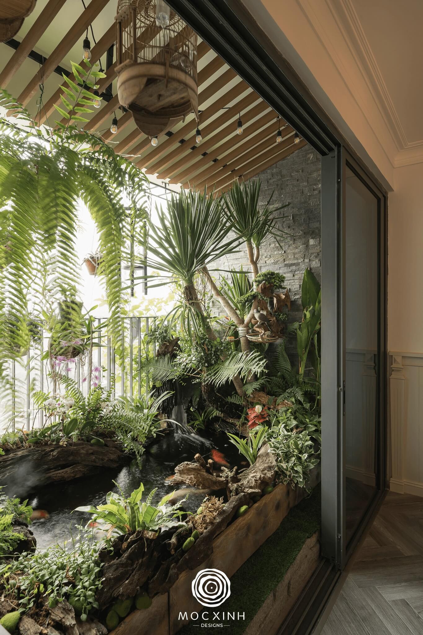 Khu vực ban công ngoài trời sở hữu một vườn cây xanh mát với các loại cây nhiệt đới tươi tốt và một vườn cá nhỏ.